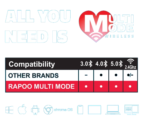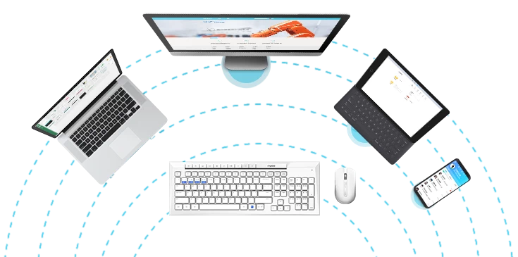 جابجایی هوشمند بین بلوتوث ۳، ۴ و وای فای ۲.۴ گیگاهرتزی ، یک اتصال بیسیم مطمئن را برقرار میکند که ۱۰ متر و ۳۶۰ درجه را پوشش میدهد. شما بدون اینکه نگران اشغال پورت یو اس بی خود باشید یا اینکه، گیرنده سیگنال بلوتوث یا وای فای شما دچار اختلال شود، میتوانید به این ست موس و کیبورد متصل شوید