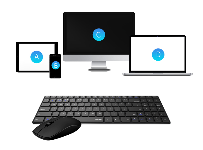 جابجایی هوشمند بین بلوتوث ۳، ۴ و وای فای ۲.۴ گیگاهرتزی ، یک اتصال بیسیم مطمئن را برقرار میکند که ۱۰ متر و ۳۶۰ درجه را پوشش میدهد. شما بدون اینکه نگران اشغال پورت یو اس بی خود باشید یا اینکه، گیرنده سیگنال بلوتوث یا وای فای شما دچار اختلال شود، میتوانید به این ست موس و کیبورد متصل شوید