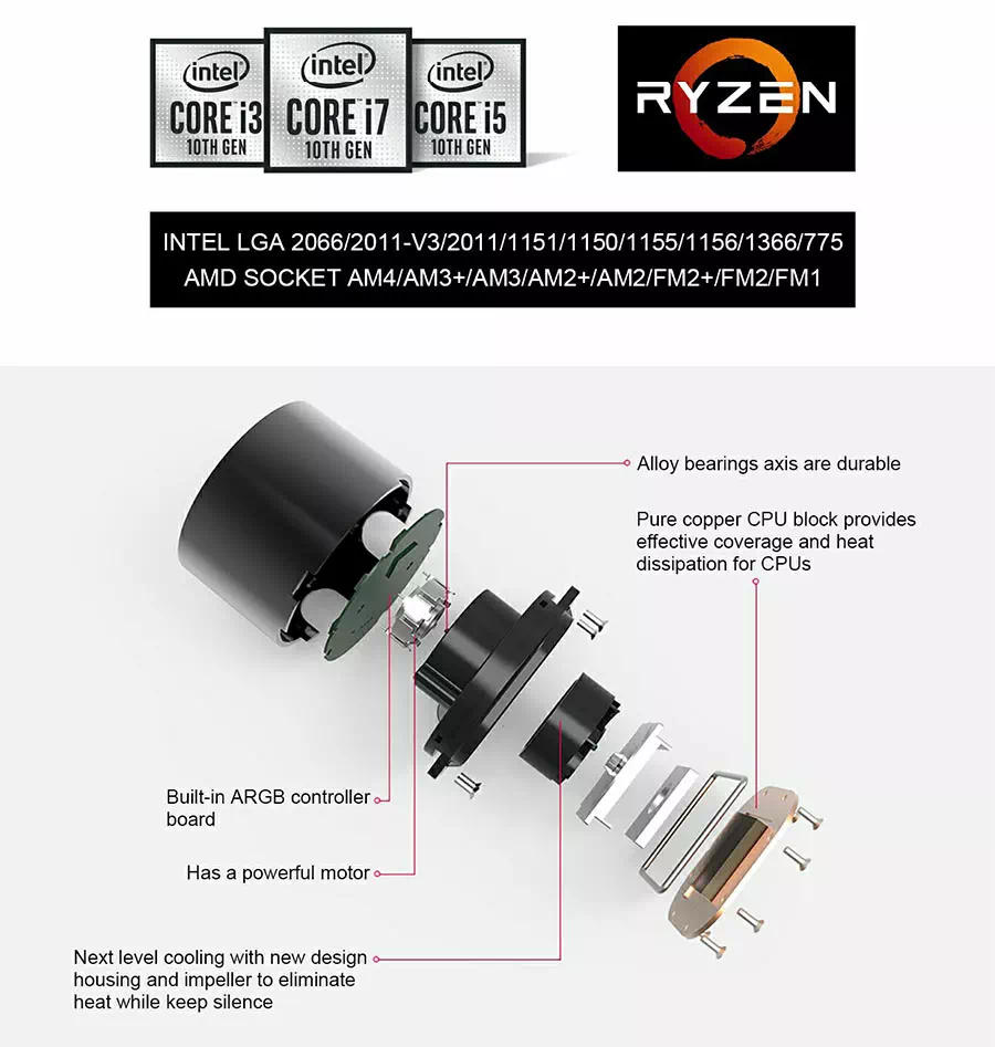 اجزای اصلی این خنک کننده (موتور،بلبرینگ،بلاک مسی،برد کنترلر RGB و …) در این عکس قابل مشاهده میباشد