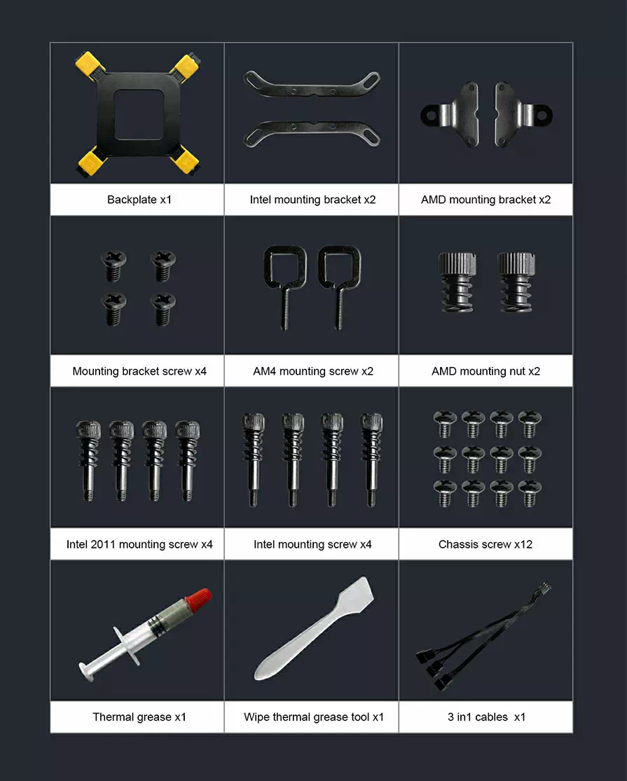 لوازم جانبی این خنک کننده پردازنده در این عکس قابل مشاهده میباشد.
