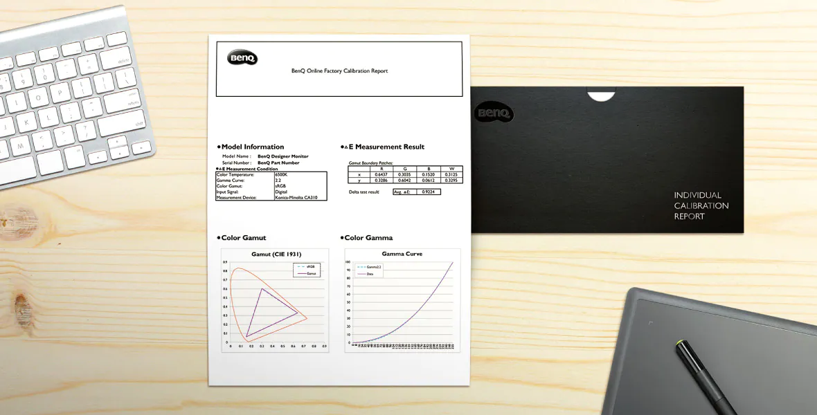 هر مانیتوری که BenQ طراحی کرده به صورت جداگانه هنگام تولید کالیبره میشود تا عملکرد دقیق Delta-E و گاما را تضمین کند. نتایج کالیبراسیون بر اساس استانداردهای رنگ صنعت تایید میشود تا واقعی ترین و زیباترین نما از محتوای اصلی را ارائه دهد.