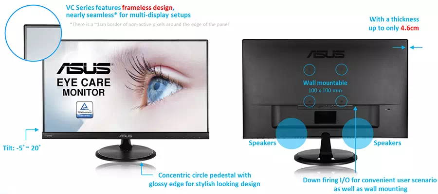 وقت خداحافظی با چشمانی خسته و کشیده است. VC239HE-W از فناوری ASUS Flicker-Free که دارای گواهینامه TUV Rheinland برای کاهش پرش های مضر است تا تجربه تماشای راحت را به ارمغان بیاورد. این فناوری برای به حداقل رساندن خستگی چشم و سایر بیماری های آسیب رسان به چشم است به ویژه هنگامی که ساعاتی طولانی و بیشمار را مقابل نمایشگر فیلم های مورد علاقه خود را تماشا میکنید.