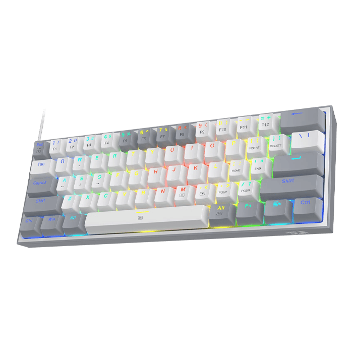 کلیدهای 60% سیمی و 2 رنگ: صفحه کلید Redragon 60% در حالت سیمی با طرح بندی کلیدهای ترکیبی دو رنگ. 61 کلید فوقالعاده فشرده ، فضای با ارزش میز را با عناصر پر جنب و جوش مانند نورپردازی و طراحی شیک زیبا تر میکند.