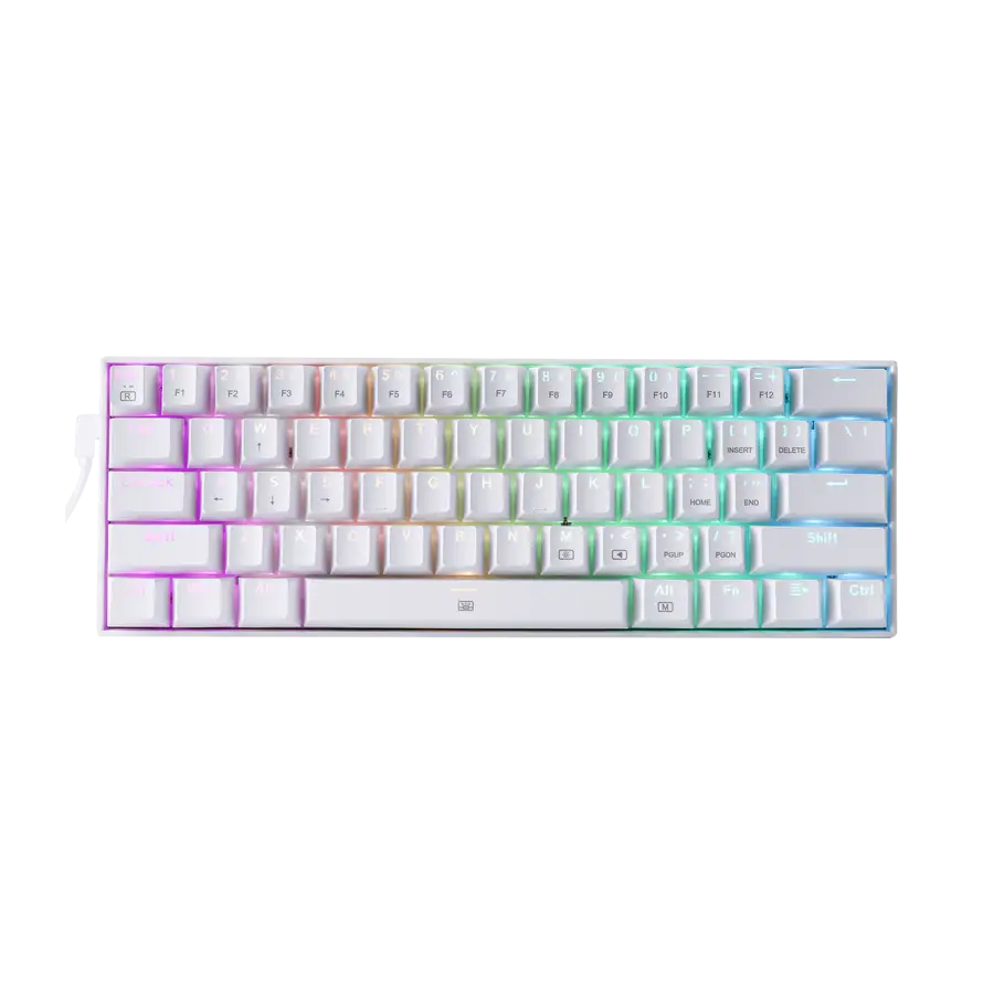 کلیدهای 60% سیمی و 2 رنگ:  صفحه کلید Redragon 60% در حالت سیمی با طرح بندی کلیدهای ترکیبی دو رنگ. 61 کلید فوق‌العاده فشرده ، فضای با ارزش میز را با عناصر پر جنب و جوش مانند نورپردازی و طراحی شیک زیبا تر میکند.