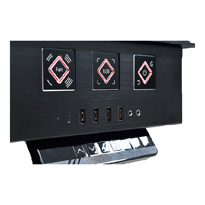 در تراز با پورت های IO مجموعه ای از دکمه ها (فن/RGB/شیشه) برای کنترل سرعت فن، رنگ روشن و حالت و جلوه شیشه وجود دارد.