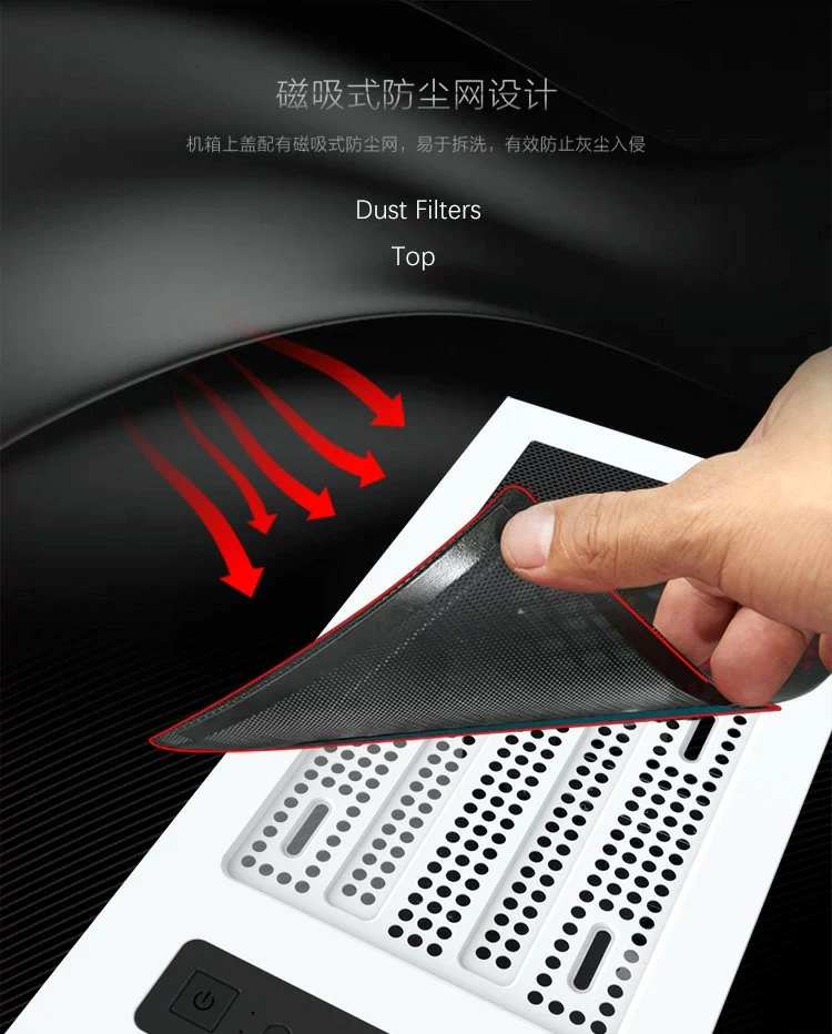 پنل بالایی این کیس طراحی هوشمندانه ای دارد، فیلتر گرد و غباری که روی این پنل قرار داده شده است مانع ورود هر نوع گرد و غبار می شود.