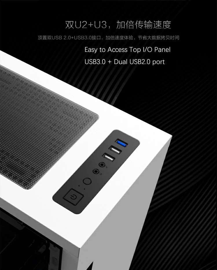 پورت USB3.0, دو پورت USB2.0, پورت HD-Audio, پورت میکروفون و دکمه های ریست و پاور روی پنل بالایی قرار گرفته اند.