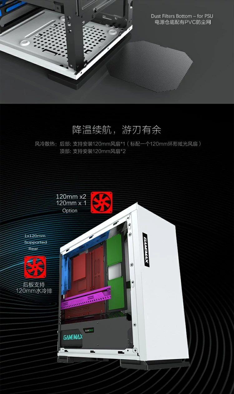 همچنین قسمت پایینی این کیس مشابه پنل بالایی از فیلتر گرد و غبار استفاده شده که یکی دیگر از ویژگی های منحصر به فرد این کیس به شمار میرود.