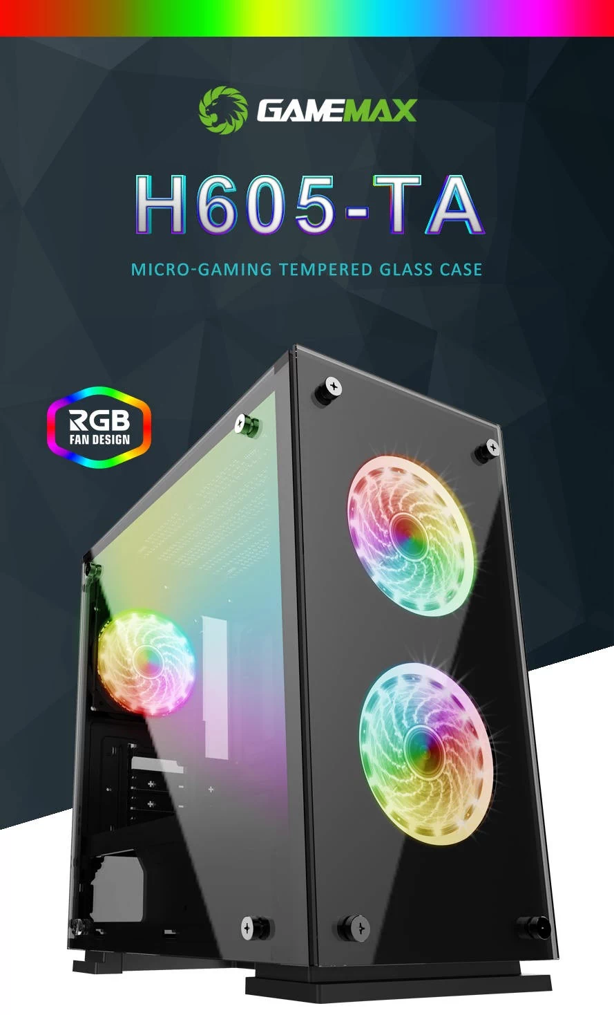 کیس H605-TA از کمپانی Gamemax دارای ویژگی های شگفت انگیزی است که حس گیمینگ حرفه ای را به کاربر میدهد. سه فن با نورپردازی RGB که قاببیت کنترل از راه دور را دارند یکی از این ویژگی ها است.