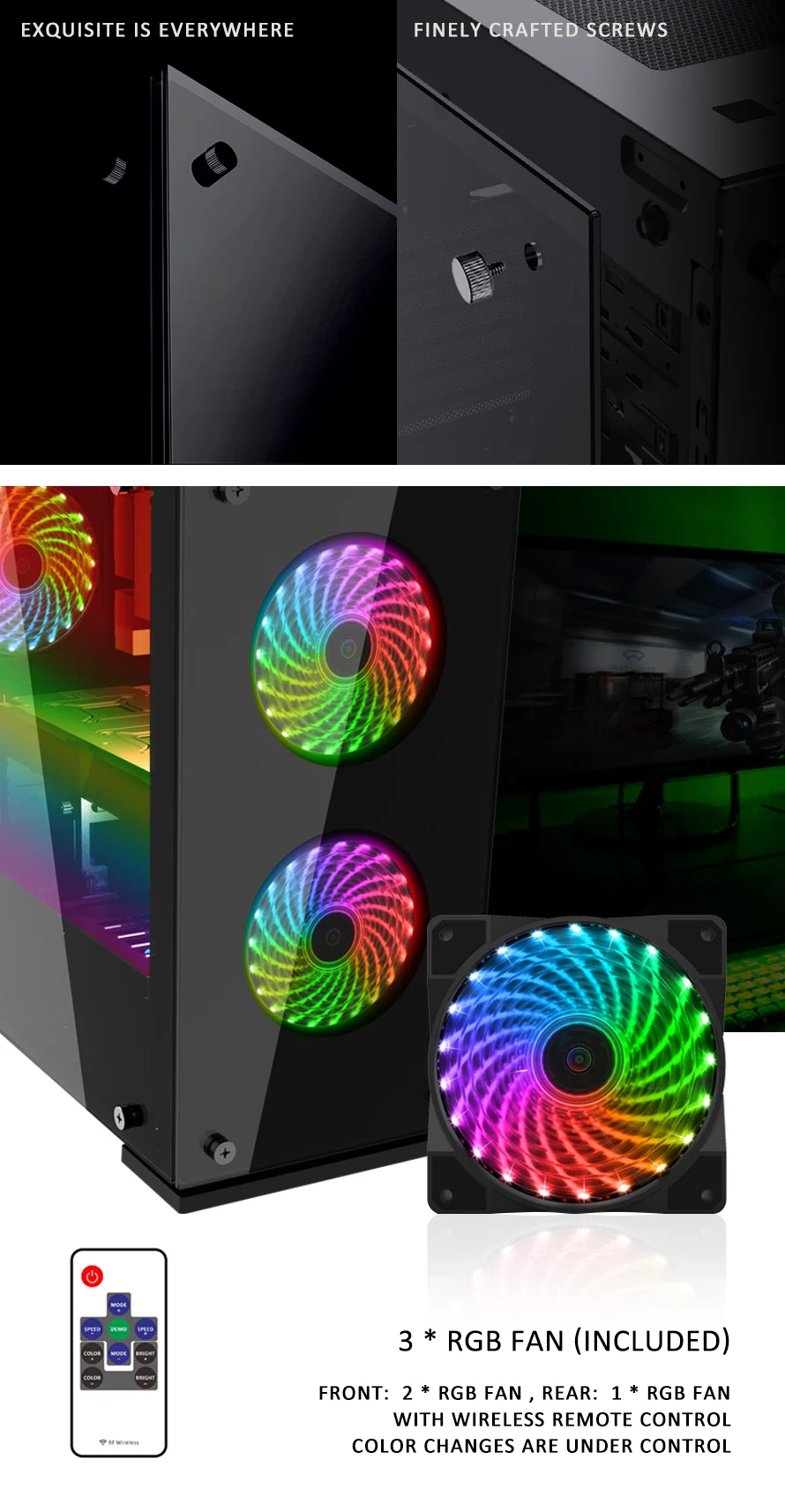 فن های RGB این کیس قابلیت کنترل از راه دور بوسیله یک ریموت کنترل را دارند.