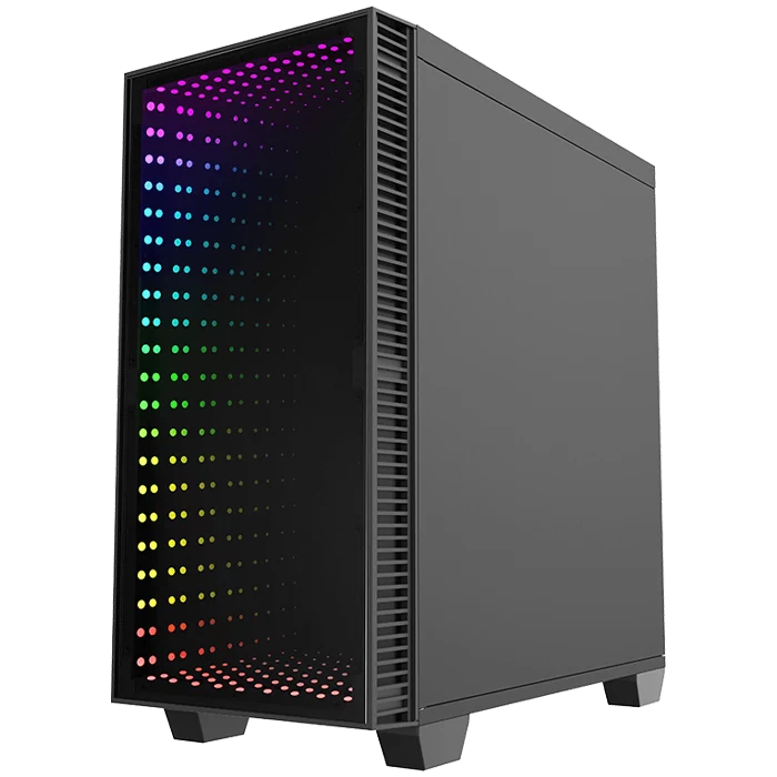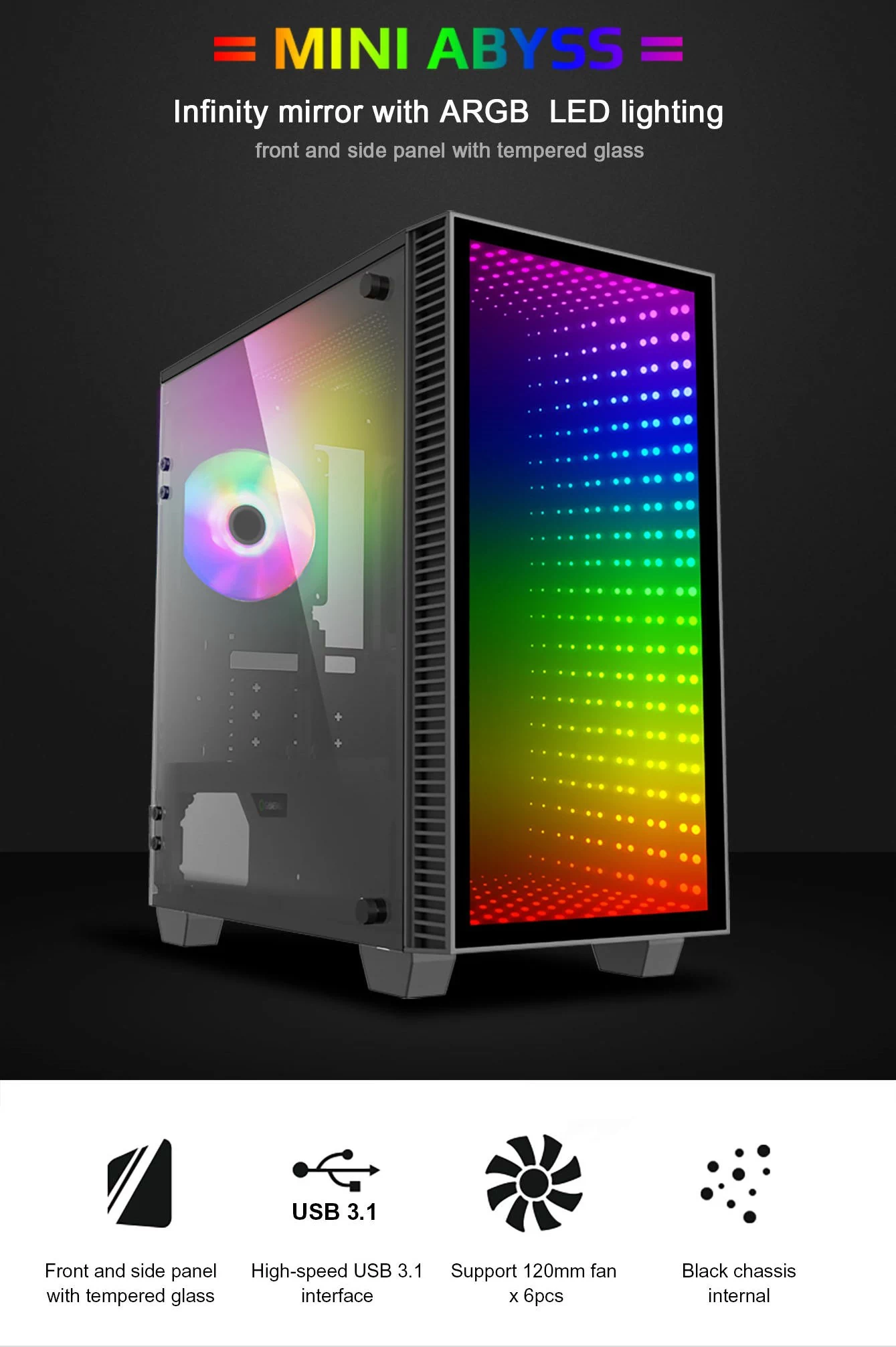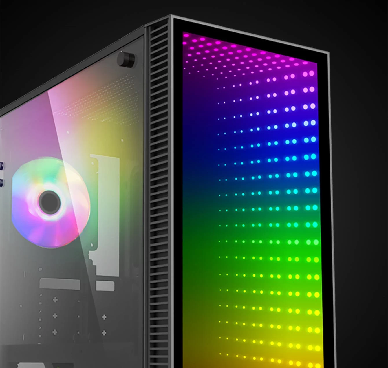 کیس Mini Abyss-H608 از کمپانی Gamemax دارای یک آیینه بینهایت در داخل کیس است که با نورپردازی RGB بوسیله چند LED ظاهر شگفت انگیزی از داخل کیس به کاربر میدهد. این نورپردازی از پنل جلویی که از شیشه حرارت دیده است، قابل مشاهده میباشد. انعکاس آیینه بینهایت نور RGB که یک توهم نوری از ابتدا تا انتهای کیس ایجاد میکند، یکی از ویژگی های منحصر به فرد این کیس میباشد. همچنین پنل سمت چپ شیشه ای کیس H608 لولا دارد و به راحتی باز و بسته میشود. این کیس یک فن 120 mm با نورپردازی RGB در پنل پشتی دارد. قابلیت پشتیبانی از 6 فن و سیستم خنک کننده آبی موجب شده تا خنک سازی در این کیس به بهترین شکل انجام گیرد و سخت افزار ها همیشه خنک بمانند.