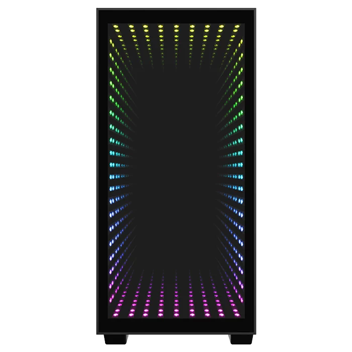 طراحی داخلی کیس از ترکیب آینه وار الهام گرفته شده است. انعکاس آینه بینهایت به کمک نورپردازی RGB نمای داخلی کیس Mini Abyss را از ابتدا تا انتهای آن بسیار جذاب نموده.