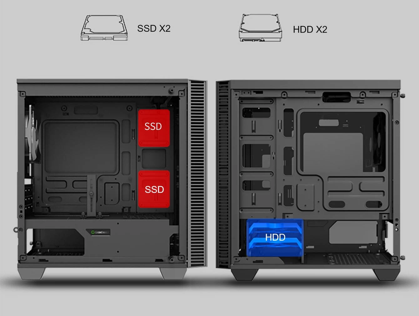 جایگاه هارد SSD در قسمت کناری و هارد HDD در قسمت پایینی کیس میباشد.