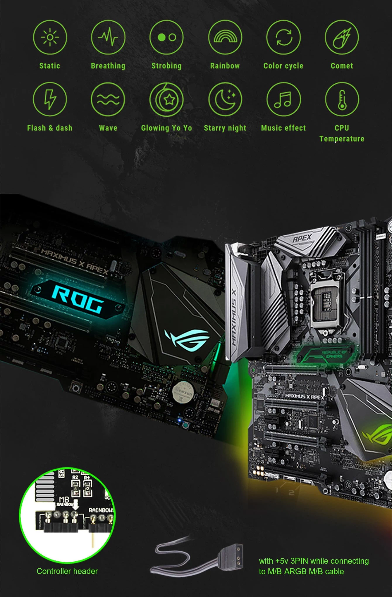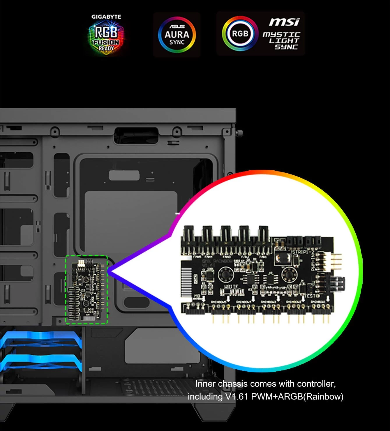 نورپردازی که با اکثر قطعات و سخت افزار ها از برند های مختلف دنیا سازگار میشود، پشتیبانی از RGB Fusion Gigabyte ، Asus Aura Sync، MSI Mystic Light Sync. دارای یک پنل کنترل RGB در داخل کیس است که این تنظیمات را در اختیار شما میگذارد. RGB این کیس حالت های مختلفی دارد و حتی میتوانید آن را با بازی خاص یا موسیقی خاصی هماهنگ کنید و از رقص رنگ ها در کیس خود لذت ببرید.