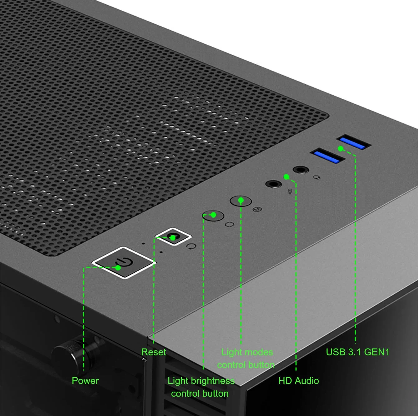 یکی دیگر از ویژگی های منحصر به فرد کیس Mini Abyss دکمه های تغییر مود رنگی و کنترل روشنایی نور RGB است