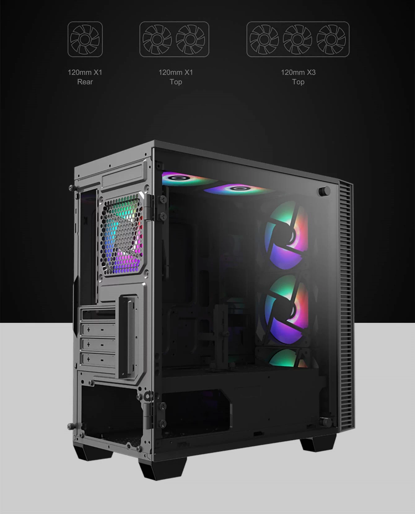 یک فن 120 mm با نورپردازی RGB در پنل پشتی قرار دارد