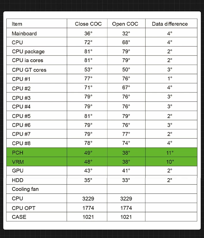 تست دمای قطعات اصلی مادربرد در این جدول قابل مشاهده است