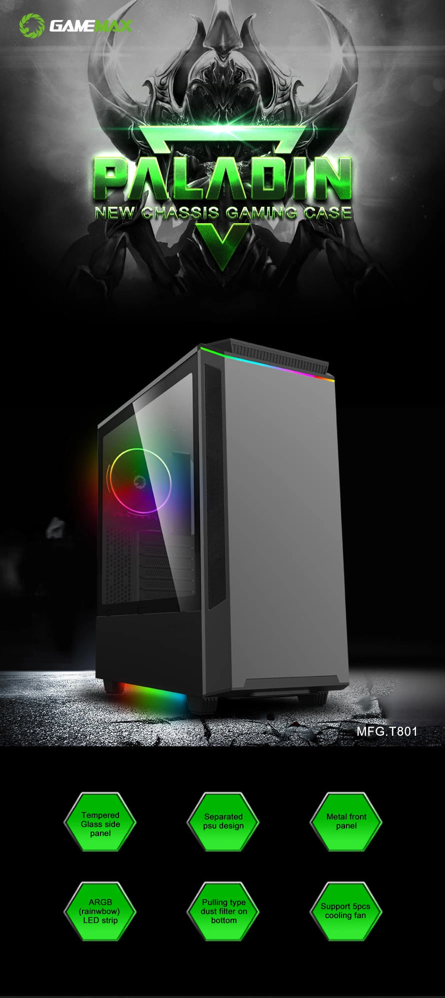 شرکت Gamemax کیس Paladin T801 را با بروزترین طرح داخلی و ظاهری عرضه کرده است. فضای داخلی این کیس طوری طراحی شده تا کاربر بتواند بروزترین سخت افزار ها را در آن نصب نموده و به گیمینگ حرفه ای بپردازد. داخل این کیس بسیار مرتب می باشد و ظاهر آن با استفاده از نوارهای RGB در پایین,بالا بسیار جذاب میباشد. پنل سمت چپ کیس Paladin شیشه ای است, این شیشه شفاف دید وسیعی از سخت افزار ها و نورپردازی داخلی به کاربر می دهد. این پنل شیشه ای دارای تنها یک پیچ است که به راحتی باز و بسته میشود. این کیس 1 فن 120 mm از پیش نصب شده با نورپردازی RGB در پنل پشتی دارد. کیس T801 دارای کنترلر باکس Rainbow HUB و Gamemax V2.0 PWM است که امکان کنترل کردن نورپردازی RGB و فن را به کاربر می دهد. یک نوار RGB در بالای پنل جلویی, یک نوار RGB در پنل پایینی و یک نوار تکه ای RGB دوازده سانتی روی فن قرار دارد که ظاهر این کیس را جذاب تر کرده است. کیس Paladin T801 از نگهدارنده عمودی کارت گرافیک برای نصب متفاوت تر نیز پشتیبانی می کند.