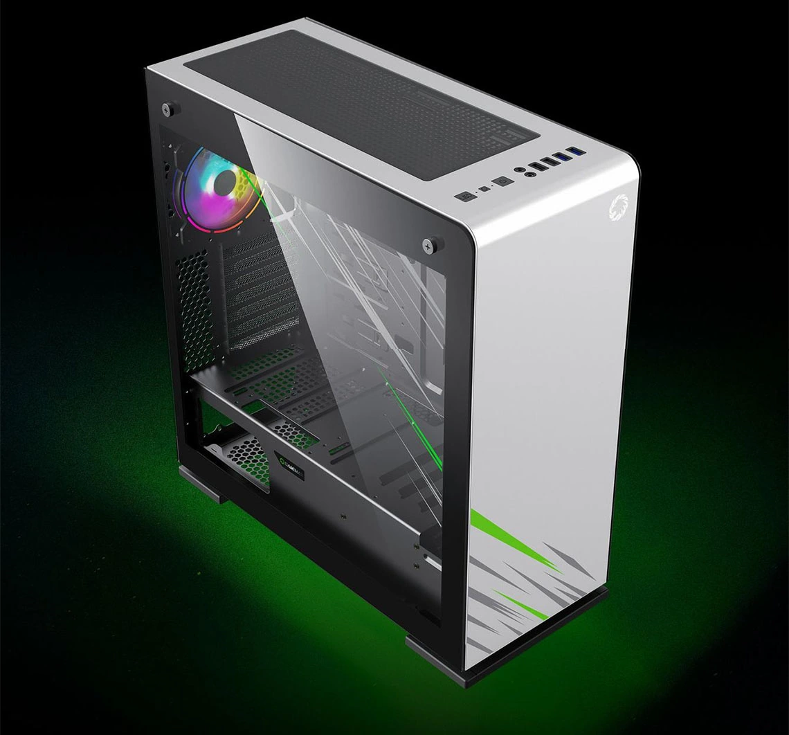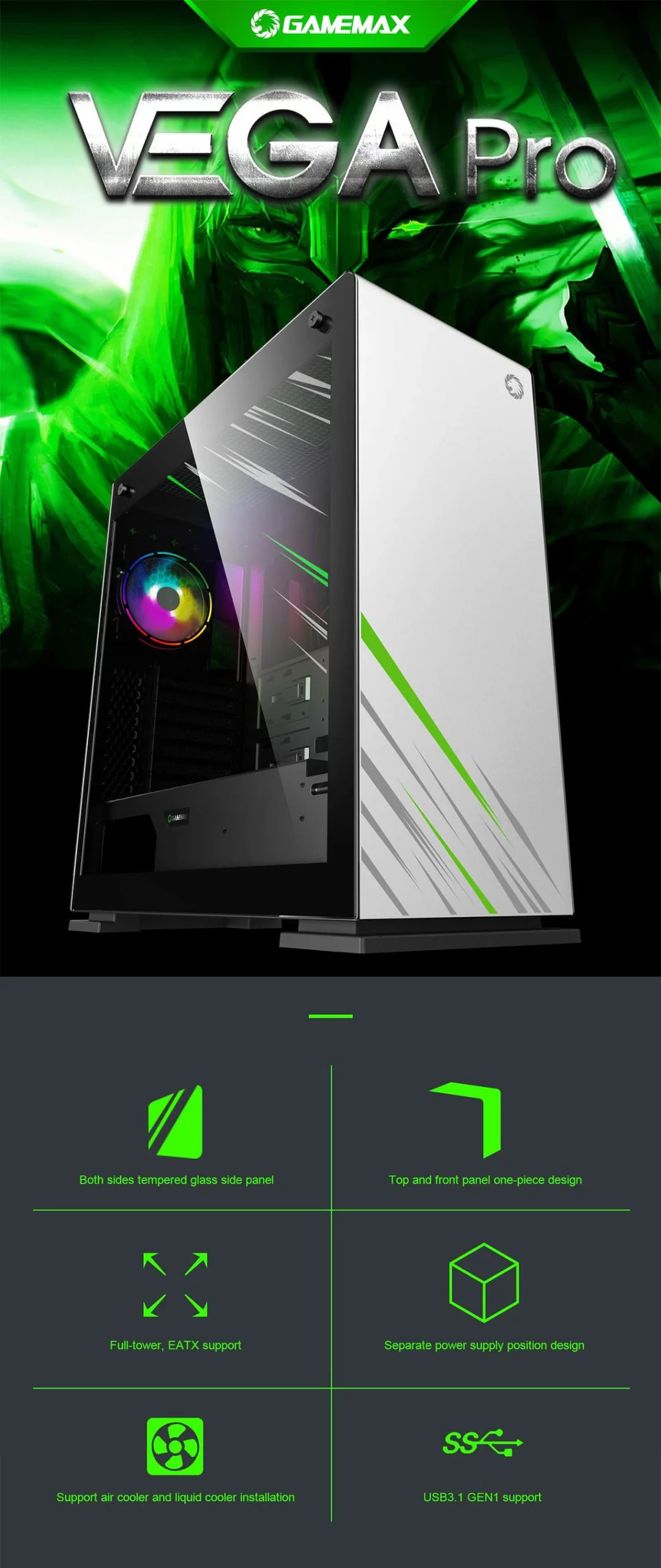 کیس Vega Pro از شرکت Gamemax با طراحی منحصر به فردی ساخته شده که نظر هر گیمری را به خود جلب میکند. پنل های چپی و راستی این کیس هردو از شیشه حرارت دیده میباشند و دید وسیعی از سخت افزارها و نورپردازی ها به کاربر می دهند. پنل های جلویی و بالایی هم بصورت یک تکه از فلز میباشد . کیس Vega Pro قابلیت پشتیبانی از 6 فن و سیستم خنک کننده آبی را دارد. کنترلر باکسی در داخل کیس نصب شده که به فن 120 mm پنل پشتی و RGB های آن نصب شده و با دکمه روی پنل بالایی این نورپردازی را میتوانید کنترل کنید. همچنین اگر این کنترل باکس(V1.7 ARGB HUB) را به مادربرد وصل کنید آپشن های بیشتری برای شخصی سازی نورپردازی ها از طریق نرم افزار خواهید داشت. فضای نصب کیس Vega Pro بسیار وسیع میباشد بطوری که از مادربرد های ATX,E-ATX هم پشتیبانی می کند.
