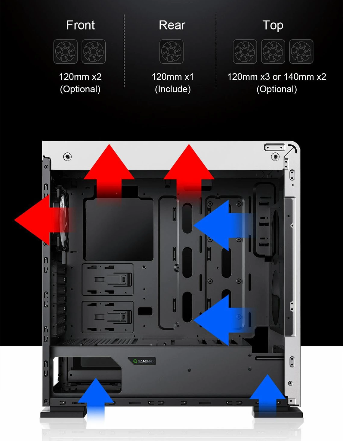 هوای خنک از جلو و پایین کیس وارد می شود و از پنل های بالا و پشتی خارج می شود
