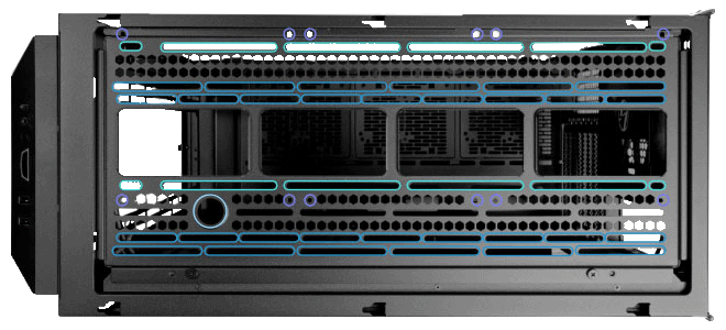 شکاف‌های نصب در کنار مادربرد با فاصله 105 میلی‌متر (برای نصب فن استاندارد 120 میلی‌متری) ارائه شده‌اند تا امکان نصب صفحه توزیع یا براکت مخزن/پمپ را فراهم کنند.