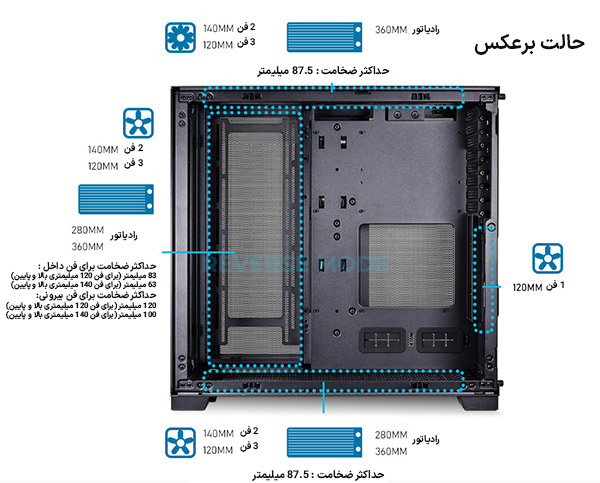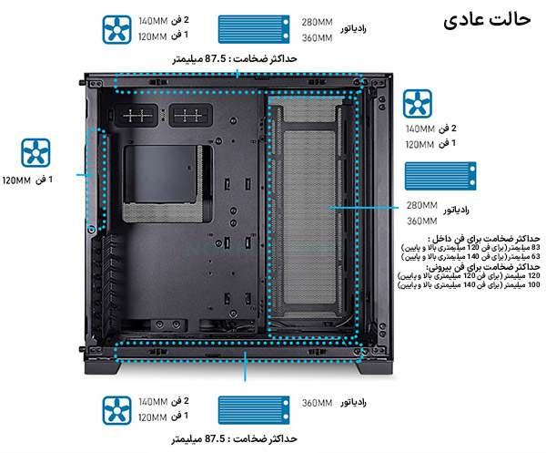 پنل بالایی : 1 رادیاتور 360 میلیمتری یا 1 رادیاتور 280 میلیمتری |