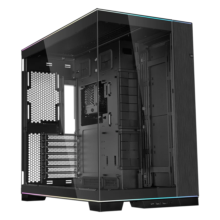 کیس گیمینگ لیان لی O11D EVO RGB دارای یک نوار ARGB به ضخامت 1.5 میلی متر در بالا و پایین است که می تواند بین 14 افکت نوری مختلف جابجا شود، روشنایی و رنگ را تنظیم کند و با مادربرد همگام شود.