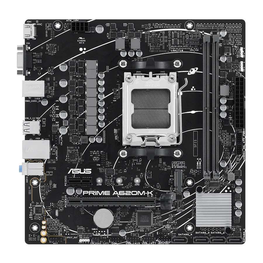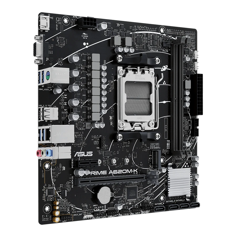 ASUS PRIME A620M-K از اتصالات پیشرفتهای مانند PCIe 4.0 برای کارت گرافیک، اسلات M.2 با سرعت 64Gbps برای حافظههای NVMe و پورتهای USB 3.2 Gen 1 بهره میبرد. این امکانات دسترسی سریع و بدون محدودیت به دادهها و سختافزارهای جانبی را فراهم میکنند.