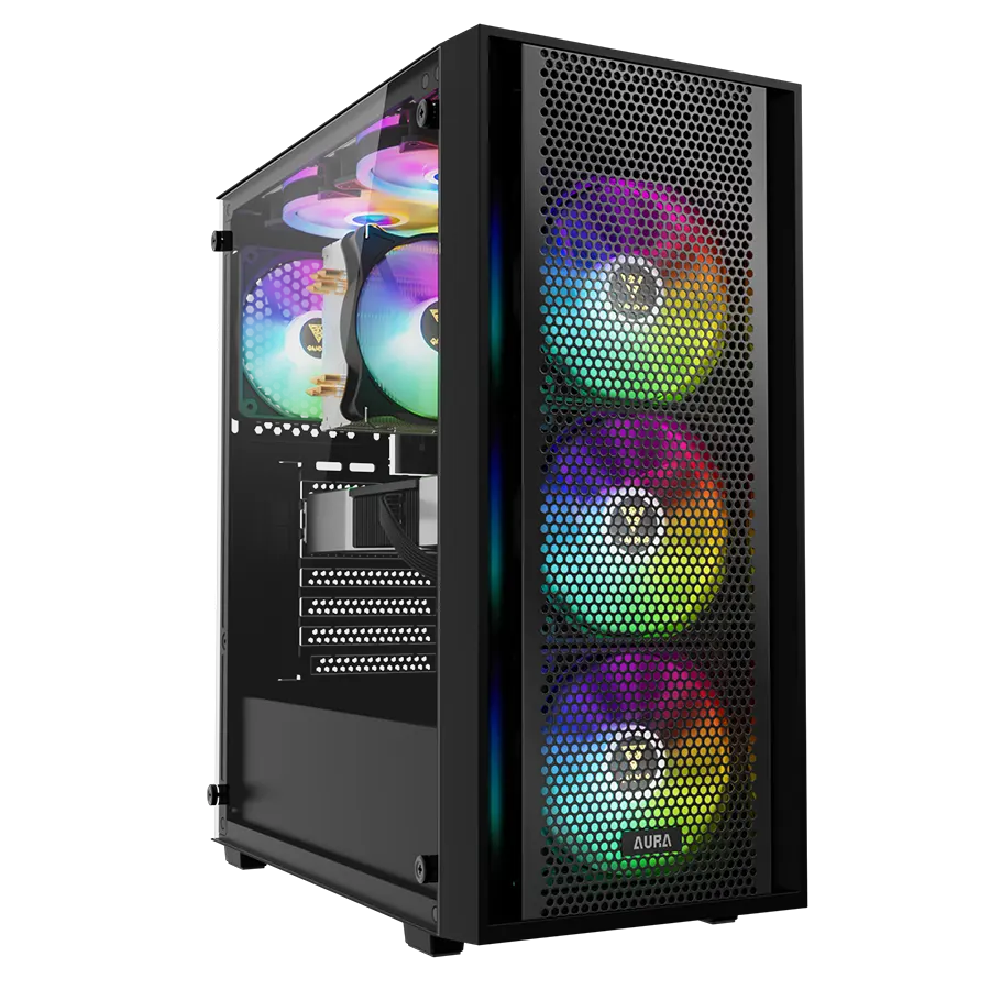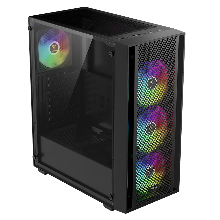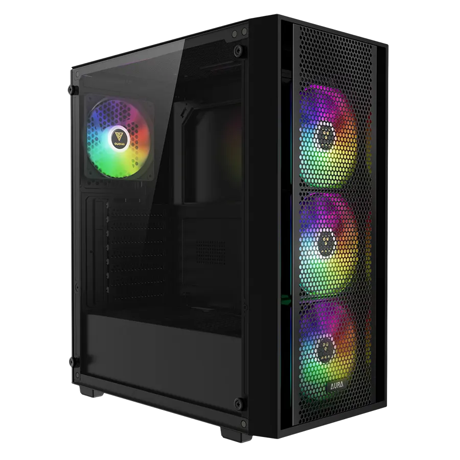 کیس گیمینگ AURA GC2 ELITE یک Mid-Tower مدرن و کارآمد از برند گیم‌دیاس است که با تمرکز بر گردش هوای مؤثر و ظاهر یکپارچه طراحی شده است. پنل جلویی پانچ شده (Perforated) مسیر ورود هوای تازه را باز می‌کند و چهار فن ARGB داخلی، هم خنک‌کنندگی یکنواخت و هم جلوه نوری چشم‌نواز فراهم می‌آورند. پنل کناری شیشه‌ای تمپر، نمای داخلی را به‌صورت تمیز و حرفه‌ای به نمایش می‌گذارد و چیدمان داخل کیس نیز برای سازگاری بهتر با قطعات امروزی بهینه شده است.