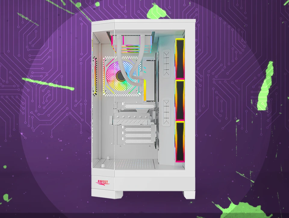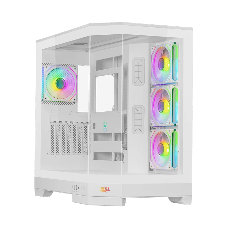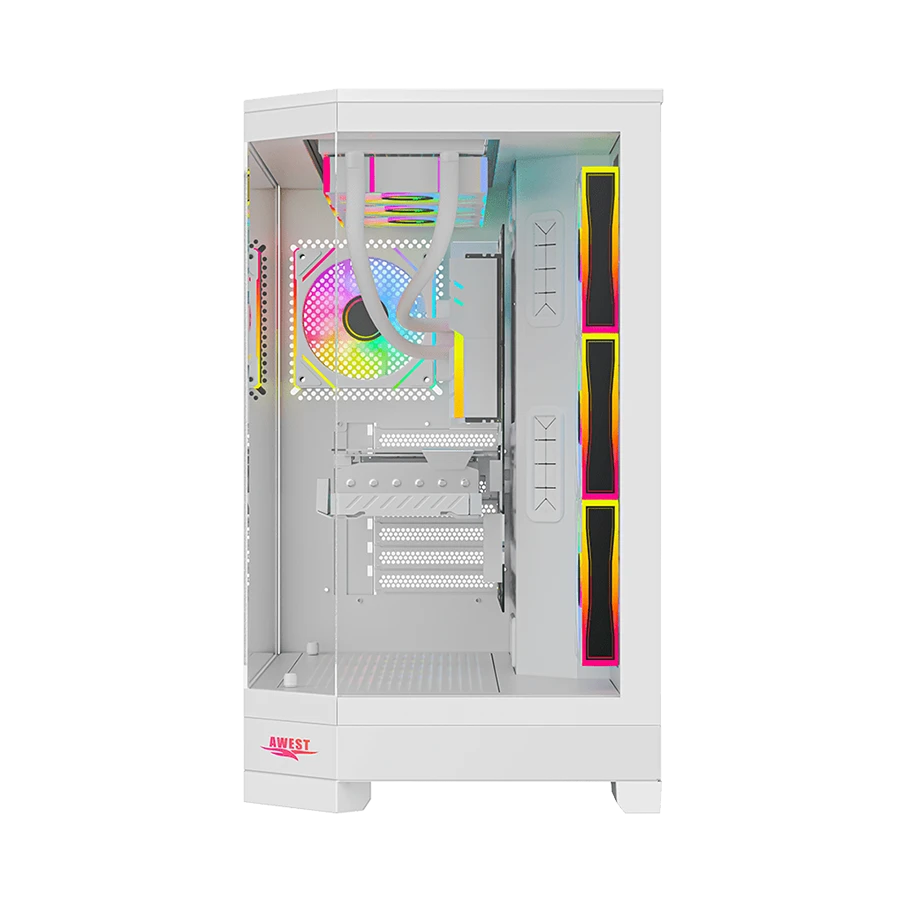 کیس گیمینگ اوست Awest GT-AQ1-MW با بهرهگیری از طراحی مدرن و ساختار ماژولار، تجربهای متفاوت برای کاربران حرفهای فراهم میکند. پنلهای شیشهای حرارتدیده در بخش جلو و کناره، دیدی گسترده و جذاب از قطعات داخلی ارائه میدهند و باعث ایجاد ظاهری چشمنواز و امروزی میشوند. استفاده از استیل ضدزنگ با ضخامت فوقالعاده یک میلیمتر، استحکام بدنه را در سطح بسیار بالایی نگه میدارد و امکان نصب تجهیزات سنگین و حرفهای را بدون نگرانی فراهم میسازد. این طراحی هوشمندانه موجب شده است تا کیس در عین زیبایی، عملکردی پایدار و طولانیمدت ارائه دهد.
