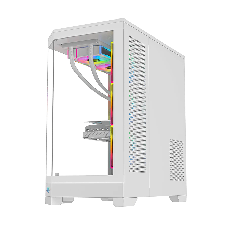 کیس GT-AQ1-MW با بهرهگیری از چهار فن ARGB پیشنصبشده شامل سه فن کناری و یک فن پشتی، جلوهای زیبا و چشمگیر ایجاد میکند. قابلیت کنترل نورپردازی از طریق هاب اختصاصی و ریموت رادیویی، امکان تنظیم جلوههای نوری متنوع را فراهم کرده و تجربه بصری فوقالعادهای ارائه میدهد. وجود سیستم نورپردازی اینفینیتی میرور در فنها باعث شده ظاهر کیس مدرن، خیرهکننده و مناسب سیستمهای گیمینگ حرفهای باشد.