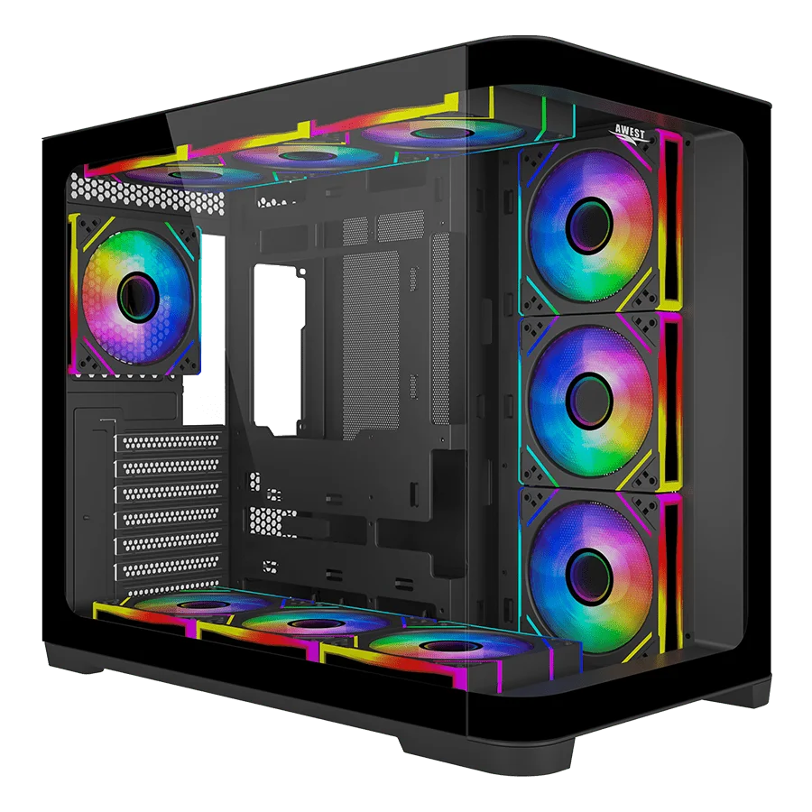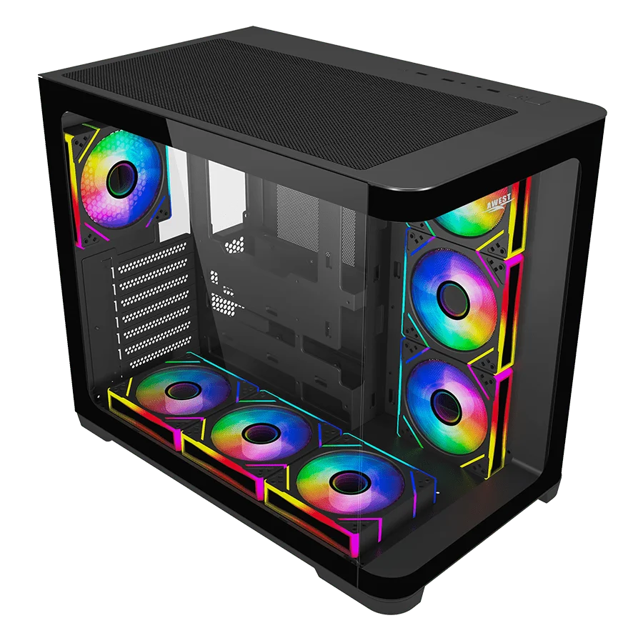 کیس گیمینگ اوست AWEST GT-AQ18-MB یکی از محصولات خاص برند اوست با طراحی مدرن است که با ترکیبی از اجزای مشبک و پانورامیک برای کاربرانی که به نورپردازی، تهویه و امکانات مدرن اهمیت میدهند ارائه میدهد. پنل جانبی به طور کامل شیشهای است و نمایی زیبا را فراهم میکند.