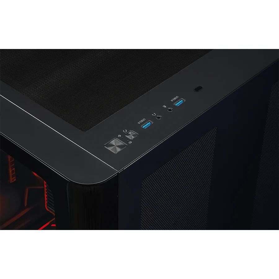 پنل I/O در قسمت بالایی کیس قرار گرفته و شامل درگاههای USB 3.0، USB Type-C، ورودی میکروفون، خروجی صدا و کلیدهای پاور، ریست و کنترل نورپردازی است. این طراحی دسترسی سریع و راحت کاربر به تمامی اتصالات و امکانات کنترل نورپردازی را ممکن میسازد.