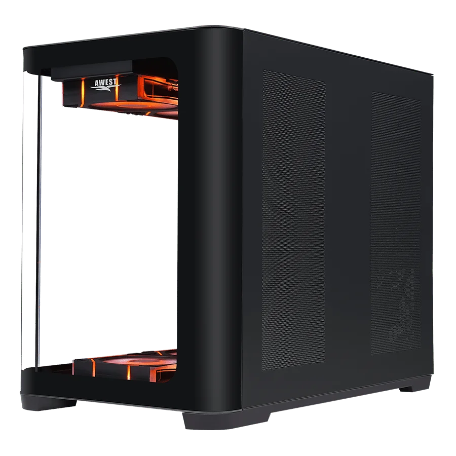 AWEST GT-AQ18-MB با پنل جانبی Tempered Glass نمایی ویترینی از قطعات داخلی فراهم میکند. حذف ستون میانی داخل کیس، دید داخلی را گستردهتر کرده و امکان نمایش نورپردازی ARGB بدون مانع فراهم شده است. ساختار بدنه با اسکلت SPCC مقاوم طراحی شده تا در عین زیبایی، استحکام لازم را داشته باشد.
