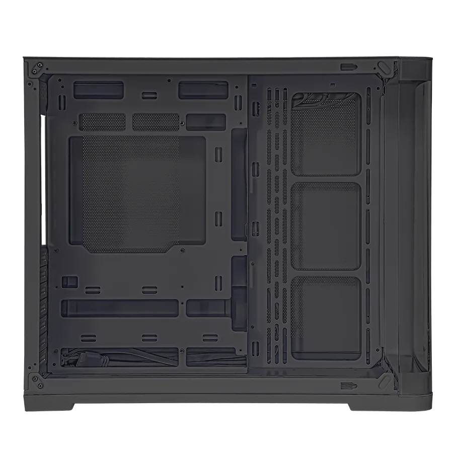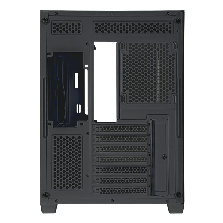 ابعاد این کیس 398 × 285 × 475 میلیمتر است و فضای کافی برای نصب کارتهای گرافیک طولانی، خنککنندههای پردازنده برج و منابع تغذیه استاندارد فراهم میکند. مکانیزم اتصال پنلهای جانبی Tool-Free است و تنها با دو پیچ در هر طرف، پنلها محکم میشوند و امکان باز و بسته کردن آسان فراهم میآید.