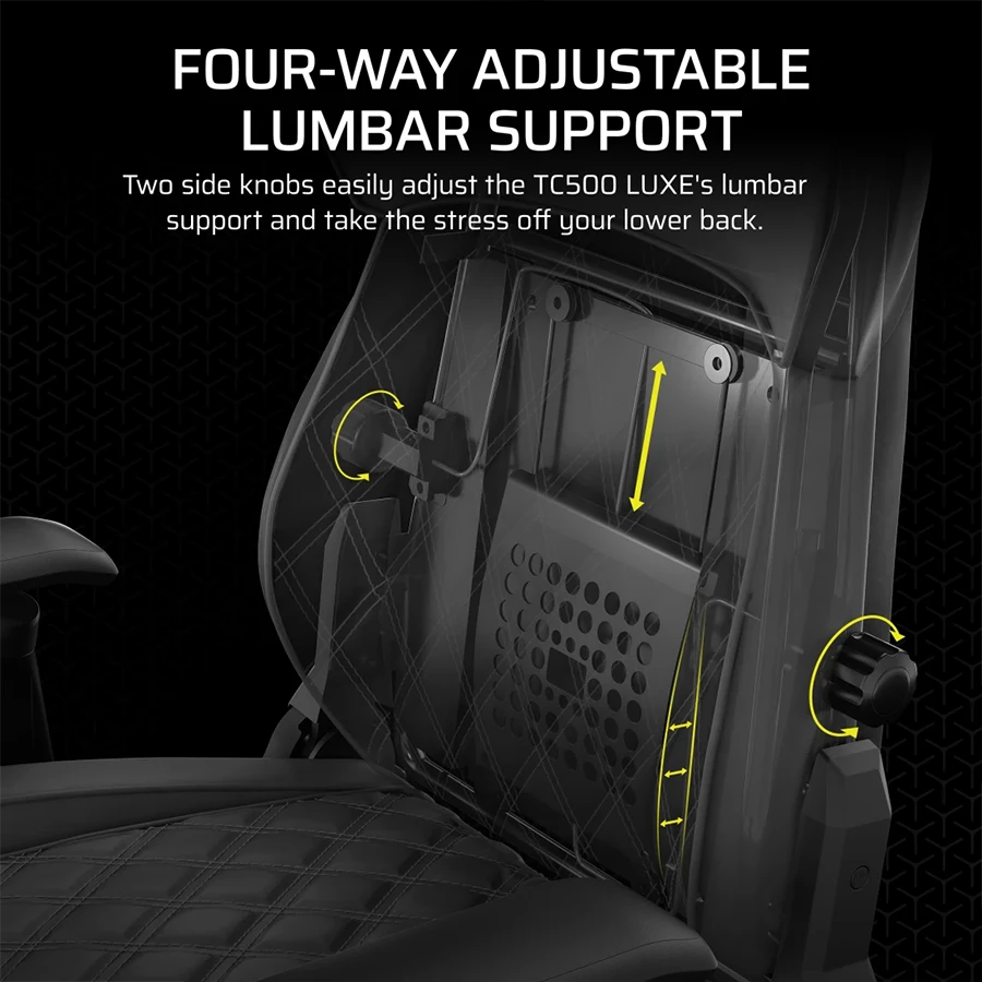 یکی از ویژگیهای برجستهی Corsair TC500 LUXE Frost سیستم چهارجهتهی تنظیم گودی کمر است. کاربران میتوانند با استفاده از پیچهای کناری، میزان پشتیبانی از ناحیهی کمر را مطابق با فرم بدن خود تنظیم کنند. این قابلیت باعث کاهش فشار ستون فقرات و جلوگیری از دردهای ناشی از نشستن طولانی میشود. پشتی صندلی از زاویه ۹۰ تا ۱۶۰ درجه قابل تنظیم است، بنابراین کاربر میتواند بین حالت کار، استراحت و بازی بهراحتی تغییر وضعیت دهد.
