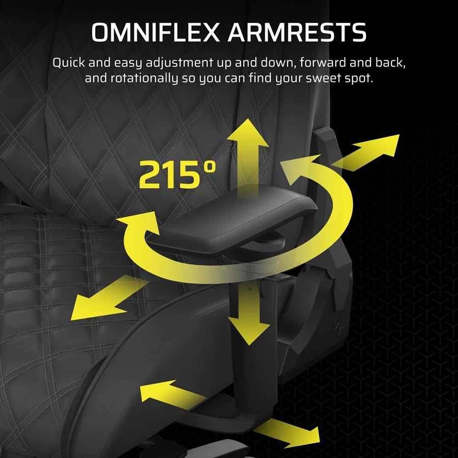 دستههای Omniflex این صندلی، قابلیت تنظیم در پنج جهت مختلف (بالا، پایین، جلو، عقب، چرخش و زاویه) را دارند. این انعطافپذیری باعث میشود موقعیت دستها در زاویهای ایدهآل نسبت به میز یا کنترلر قرار گیرد. این طراحی برای گیمرهایی که زمان زیادی را در حال بازی سپری میکنند، اهمیت ویژهای دارد. تنظیم سریع و آسان آن نیز تجربه کاربری روان و بدون دردسر را فراهم میکند.