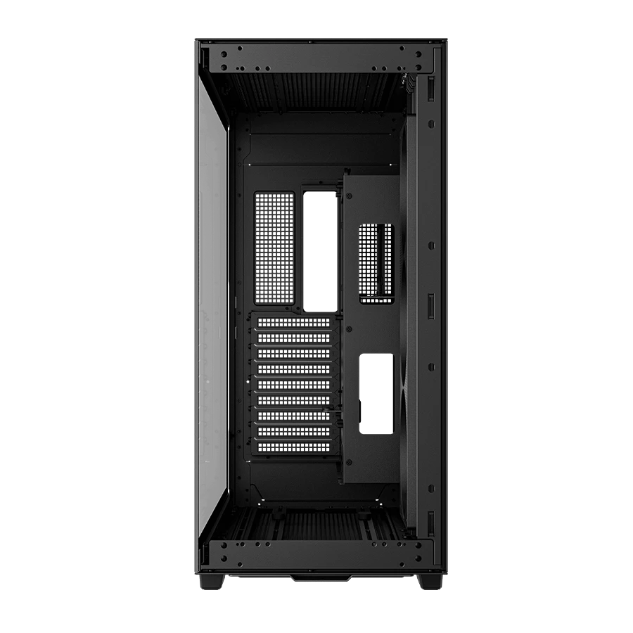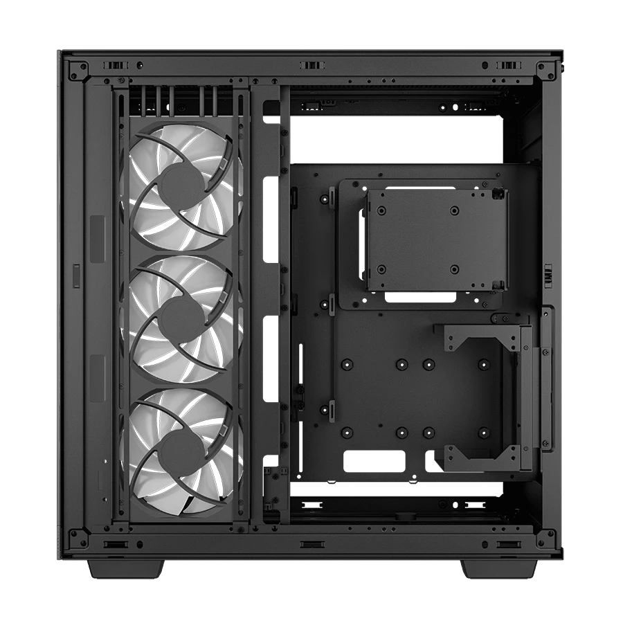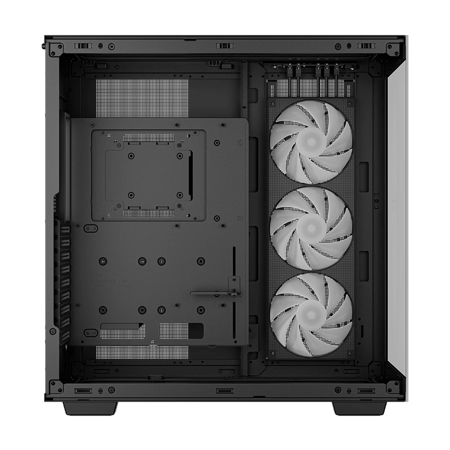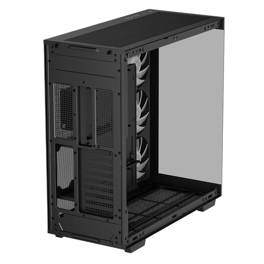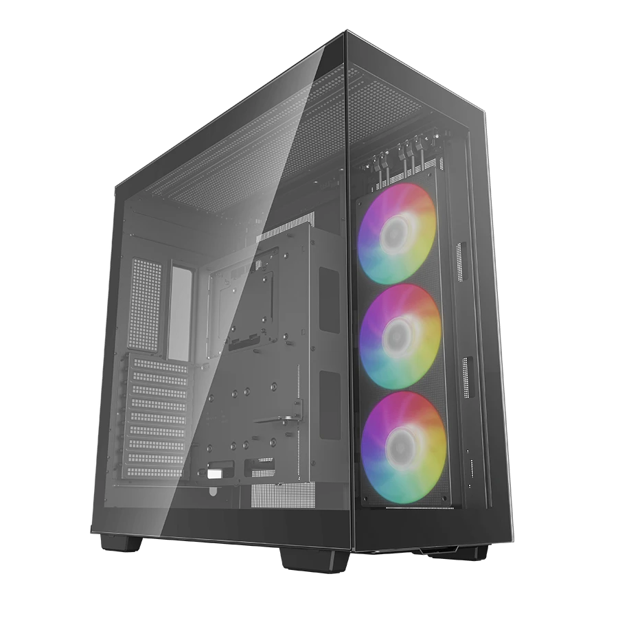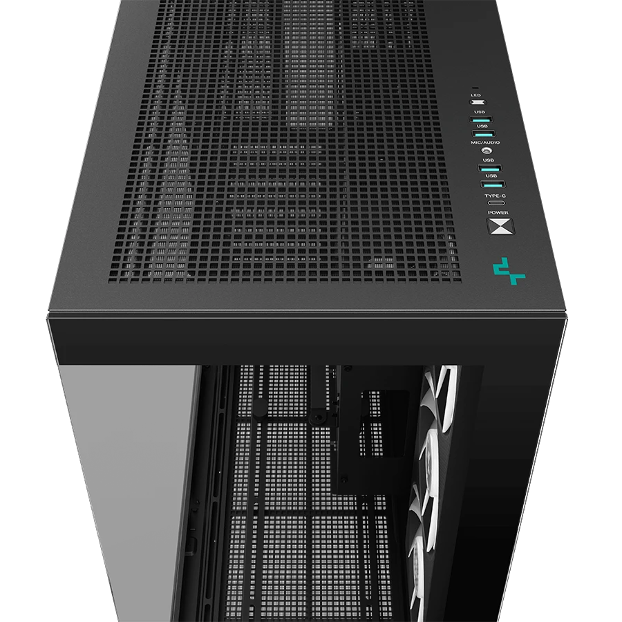 کیس گیمینگ دیپ کول مدل DeepCool CH780 BLACK با طراحی پانورامیک شیشهای و چیدمان دوگانه، جذابیت بصری بینظیری ارائه میدهد. پنلهای شیشهای حرارتدیده، دید واضحی از سختافزارهای داخلی را فراهم میکنند و فضای داخلی دوگانه این امکان را میدهد که مدیریت کابلها، درایوها و منبع تغذیه به صورت مرتب در بخش دوم قرار گیرند. نبود ستون مرکزی (A pillar) دیدی کاملاً شفاف و بدون مانع از سختافزارهای اصلی را تضمین میکند.
