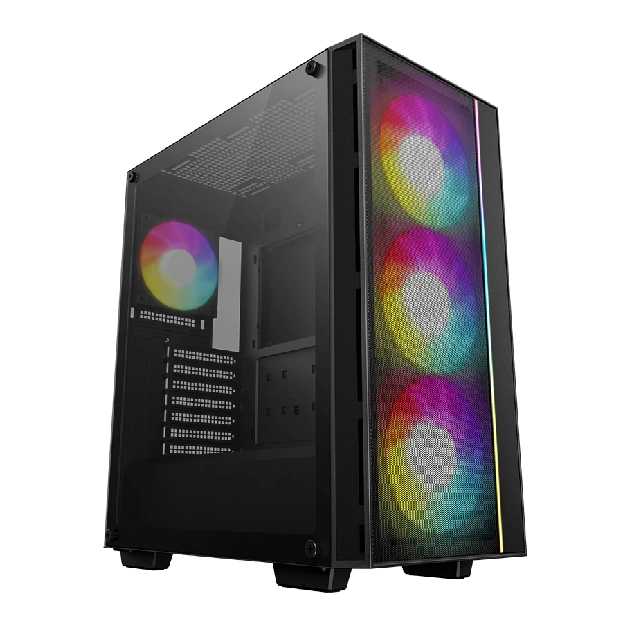 کیس گیمینگ دیپ کول مدل DeepCool MATREXX 55 MESH V4 C با طراحی جذاب و پنل جلویی مشبک با جریان هوای بالا، جلوهای شیک و مدرن دارد. این کیس به سه فن 140 میلیمتری ARGB PWM در جلو و یک فن 120 میلیمتری ARGB در پشت مجهز شده است که علاوه بر افزایش زیبایی، عملکرد خنککنندگی فوقالعادهای ارائه میدهند. نوار LED در قسمت راست پنل جلویی نیز جلوهای ویژه به طراحی این کیس اضافه کرده است.