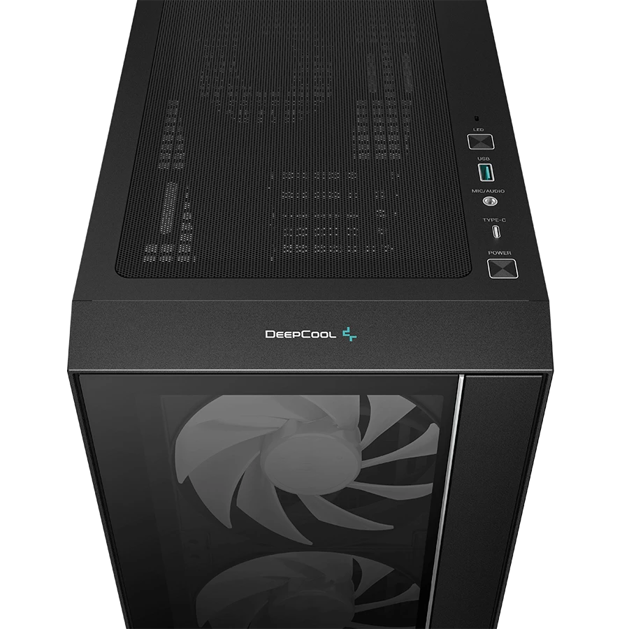 در بخش بالایی کیس، یک پنل I/O کامل و کاربرپسند در دسترس است. که شامل پورت USB 3.0، پورت Type-C و درگاه ترکیبی صدا میشود. همچنین دکمه اختصاصی کنترل نورپردازی ARGB نیز در همان قسمت تعبیه شده است. که دسترسی سریع و آسان به تنظیمات جلوههای نوری را فراهم میکند. این امکانات، تجربهای مدرن و بیدردسر را برای کاربر رقم میزنند.