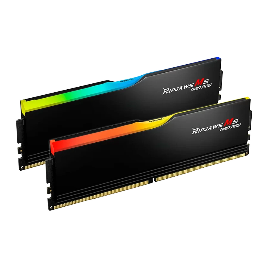 رم دسکتاپ دو کاناله G-Skill مدل Ripjaws M5 RGB Neo 32GB 6400 Black یکی از حرفهایترین انتخابها برای گیمرها و کاربران علاقهمند به اورکلاک است. این ماژول با طراحی زیبا و خنککننده آلومینیومی سفید مات، علاوه بر کارایی بالا، جلوهای مدرن به سیستم شما میبخشد. استفاده از استاندارد DDR5 و پشتیبانی از پروفایل AMD EXPO، عملکردی فوقالعاده در پلتفرمهای AM5 ارائه میدهد.
