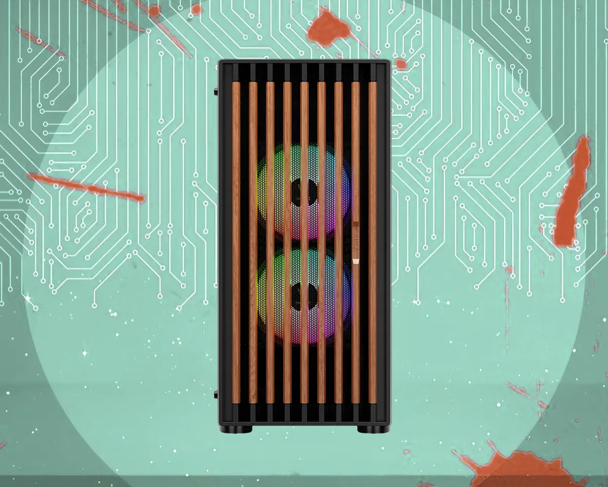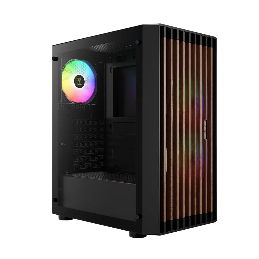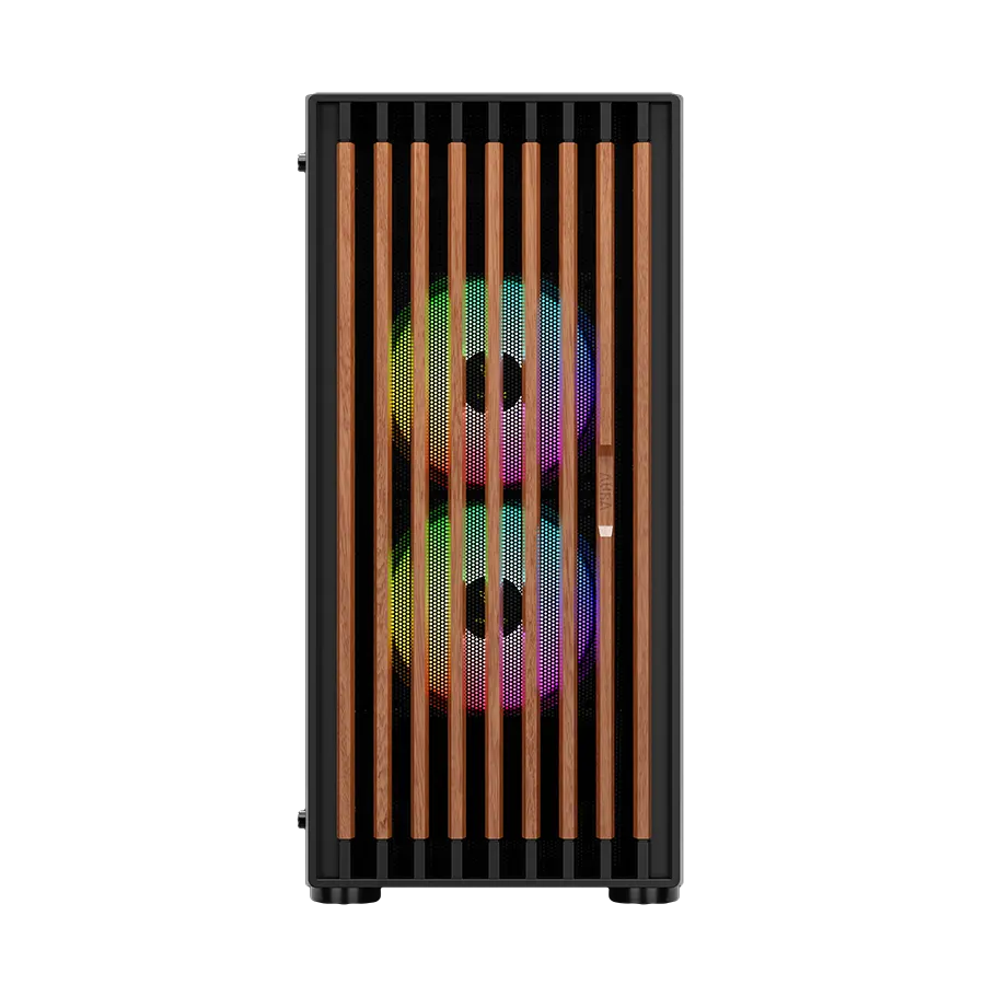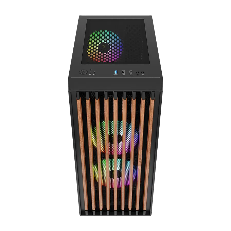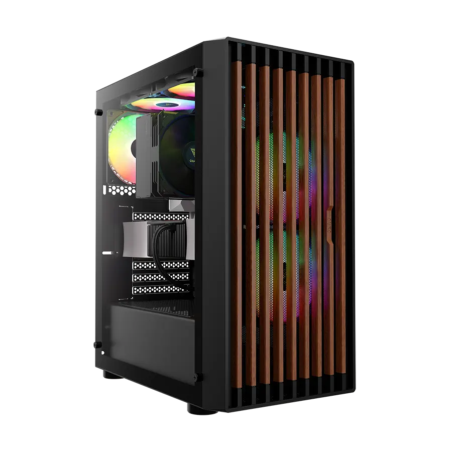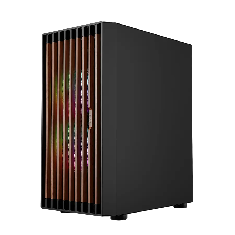 پنل جلویی چوب گردوی واقعی همراه با Mesh RGB باعث میشود ظاهر کیس تفاوت بصری قابل ملاحظهای داشته باشد. ترکیب چوب طبیعی و فلز مشدار RGB، جلوهای خاص ایجاد کرده که هم زیبا باشد هم جریان هوایی مطلوب را ممکن سازد. سه فن ARGB نصبشده در پنل جلو به همگامسازی رنگها کمک کرده و نورپردازی زیبا و متغیری درون کیس ارائه میدهند.
