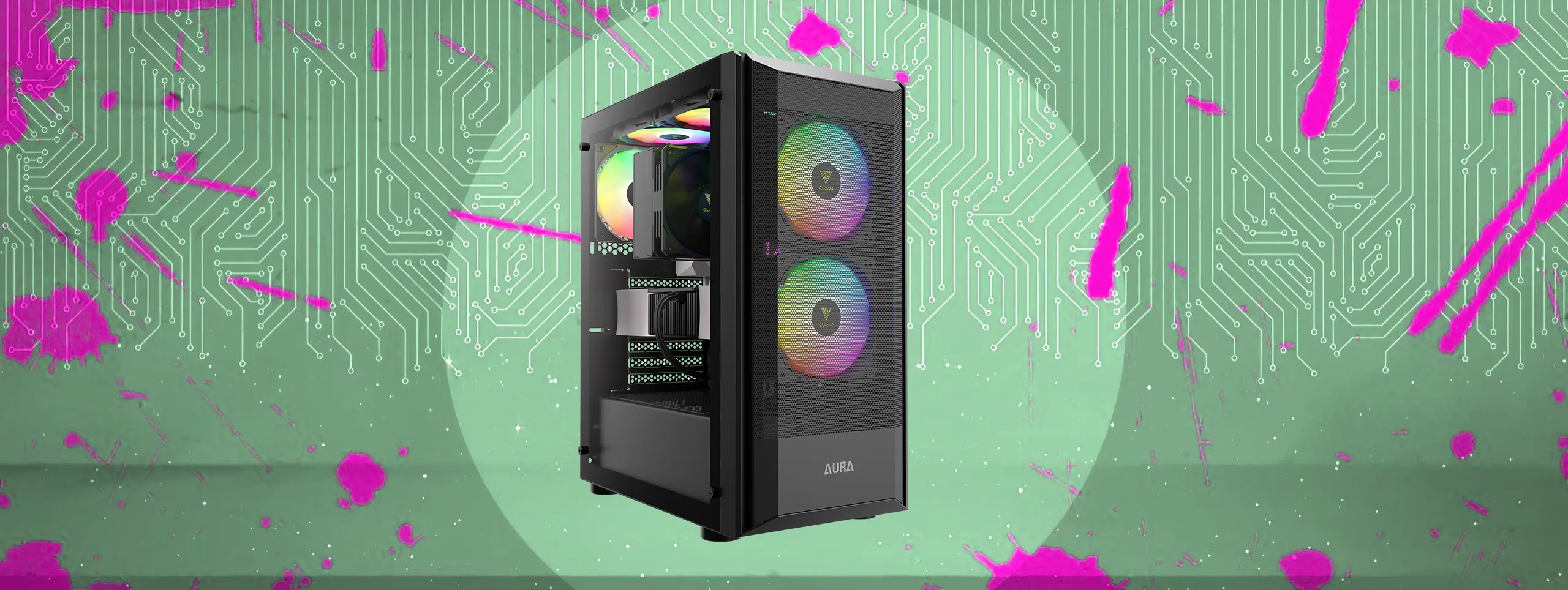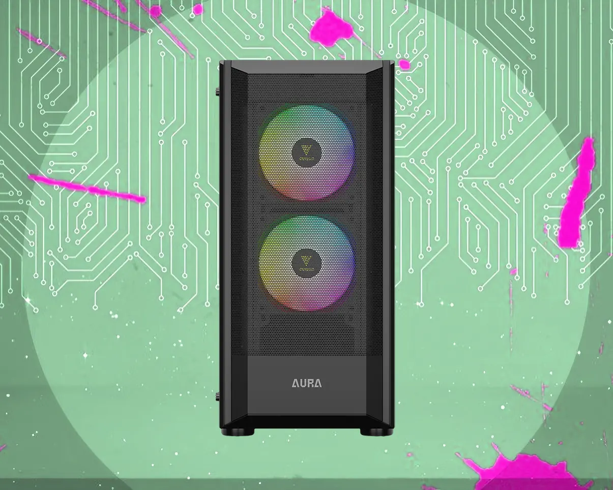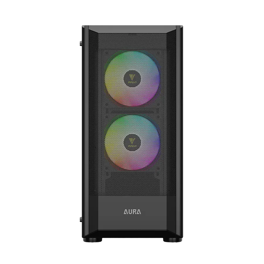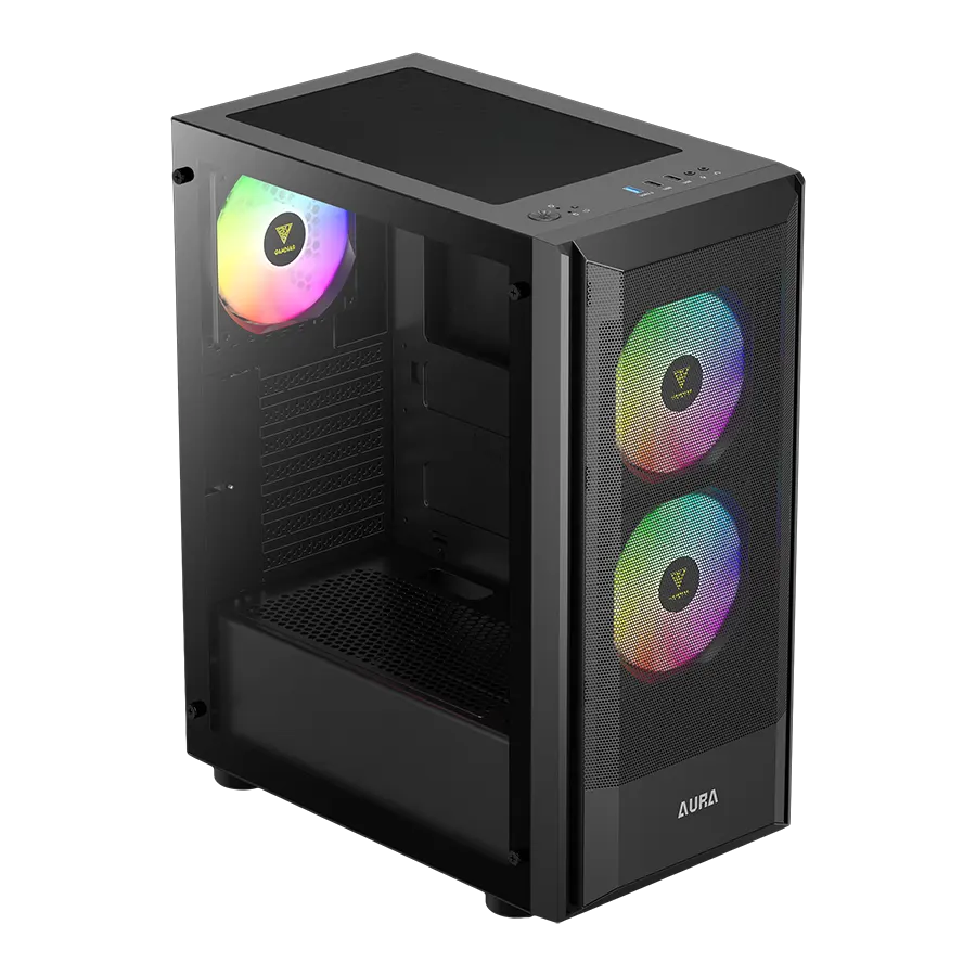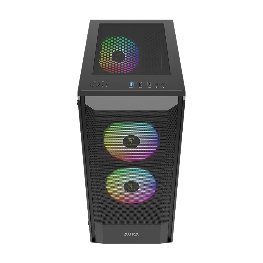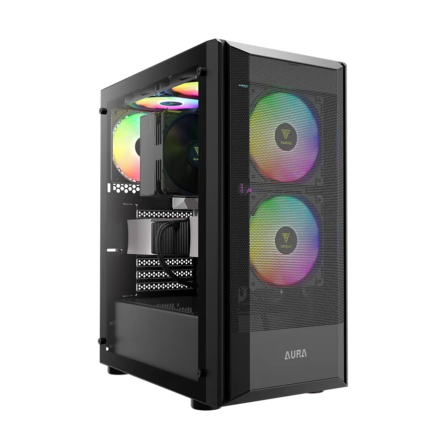 AURA GC6 با جلوهای شیک و ساده عرضه میشود. پنل جلویی مشبک جریان هوای مطلوبی را ایجاد میکند و پنل کناری شیشهای سکوریت، نمایی کامل از قطعات داخلی و نورپردازی ARGB سیستم شما ارائه میدهد.