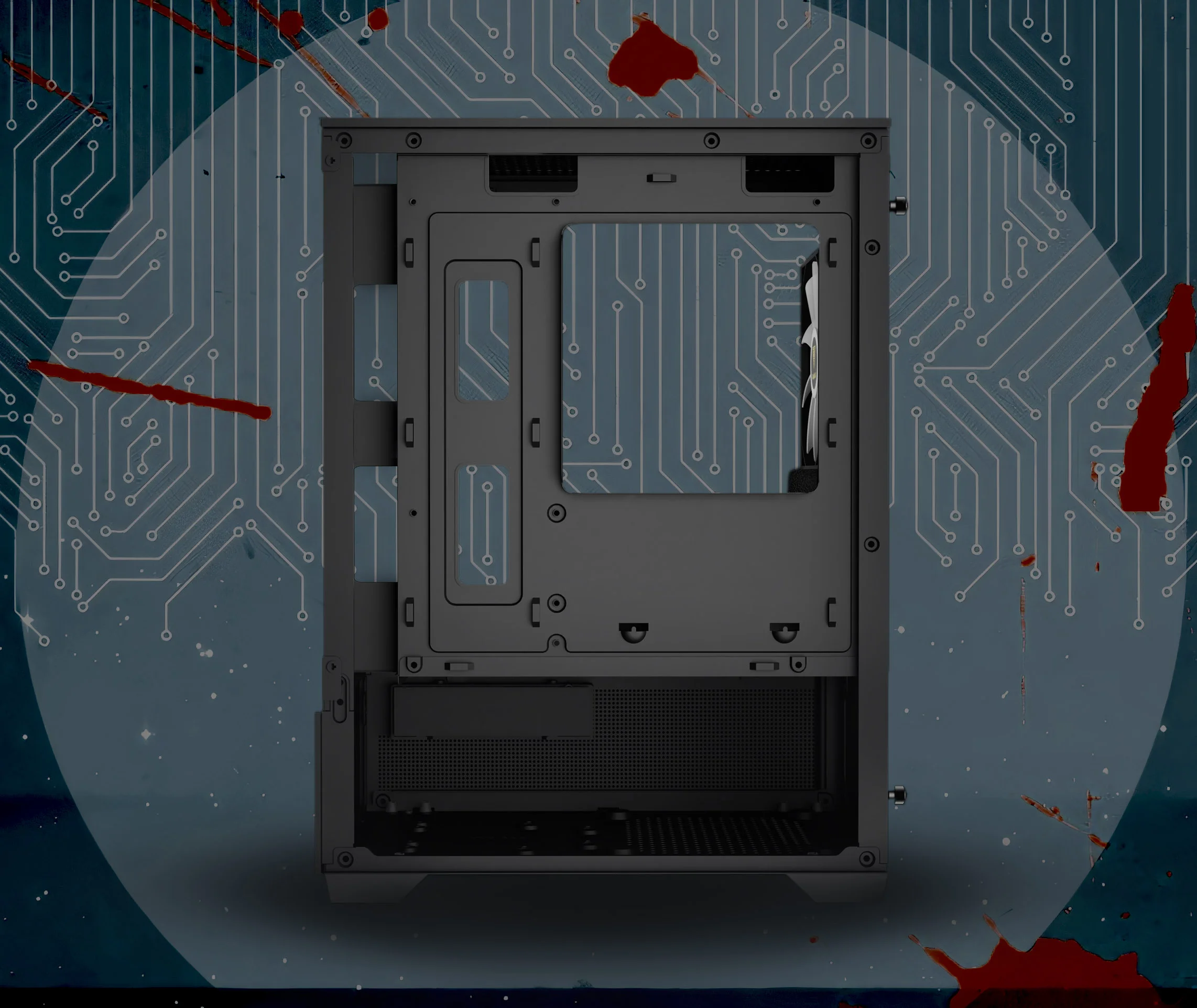 در بخش خنککنندگی و زیبایی، سه فن ۱۲۰ میلیمتری ARGB بهصورت پیشفرض روی کیس نصب شدهاند (دو فن در پایین بهصورت ورودی و یک فن در پشت بهعنوان خروجی). این ترکیب نه تنها جریان هوای مطلوبی را ایجاد میکند، بلکه به کمک نورپردازی Addressable RGB محیطی چشمنواز فراهم میآورد.