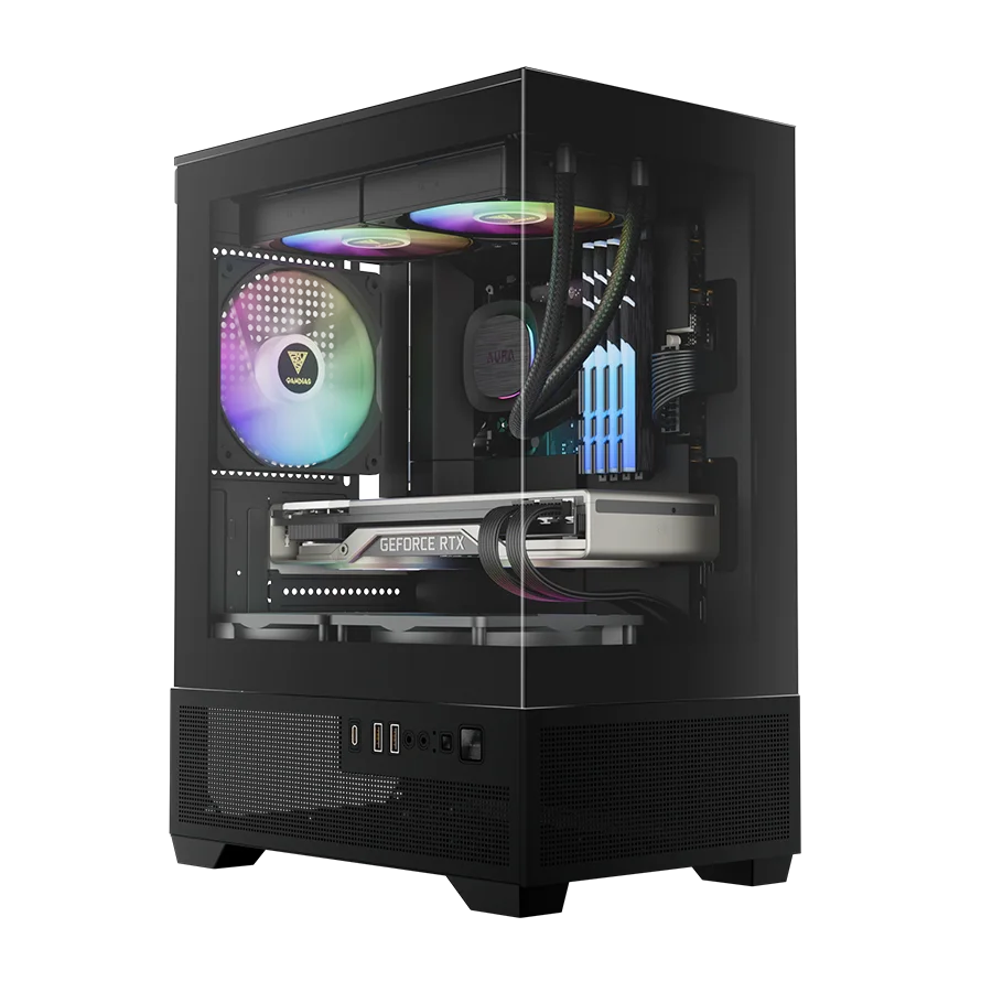 کیس Gamdias Aura GC9M Elite Black به معنای واقعی کلمه یک ویترین گیمینگ است. پنل کناری شیشهای سکوریت پانورامیک، نمایی کامل از سختافزار داخلی شما ارائه میدهد. این طراحی برای کسانی که به اسمبل تمیز، نورپردازی RGB و نمایش قطعات سختافزاری علاقه دارند، بسیار جذاب خواهد بود.