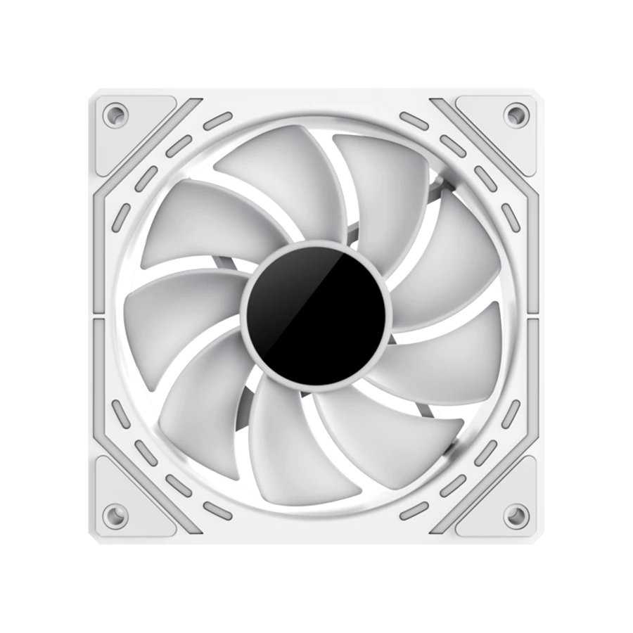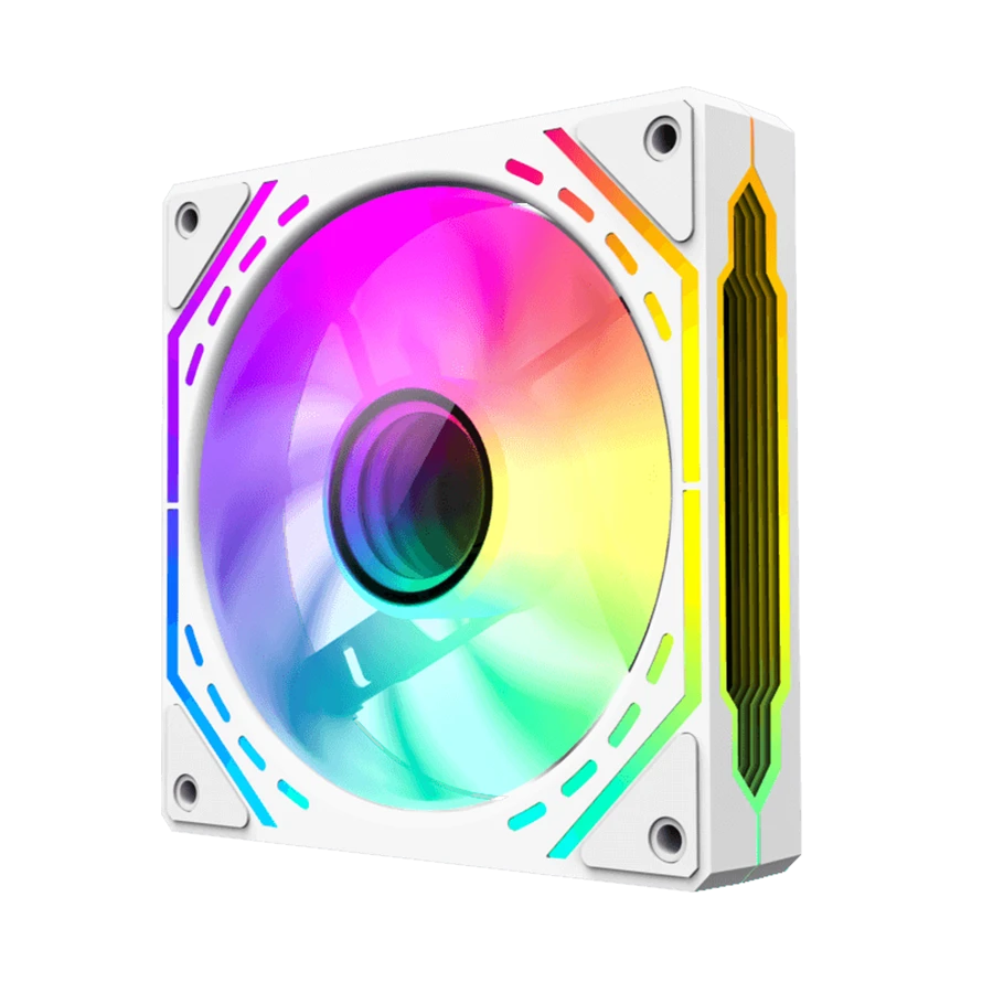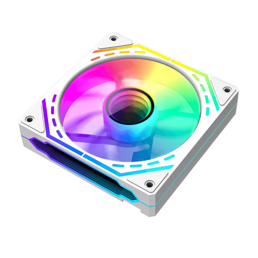 فن FN12A-S2I-RW مجهز به نورپردازی ARGB با حلقه نور و طراحی آیینه‌ای در اطراف بدنه سفید رنگ خود است. مجموع ۲۴ عدد LED، شامل ۸ عدد در مرکز و ۱۶ عدد در حلقه بیرونی، جلوه‌ای چشمگیر و قابل تنظیم ایجاد می‌کنند. این نورها از طریق اتصال ۳ پین Aura به مادربرد، به راحتی با دیگر قطعات همگام‌سازی می‌شوند.