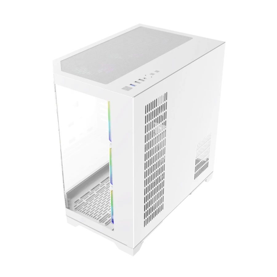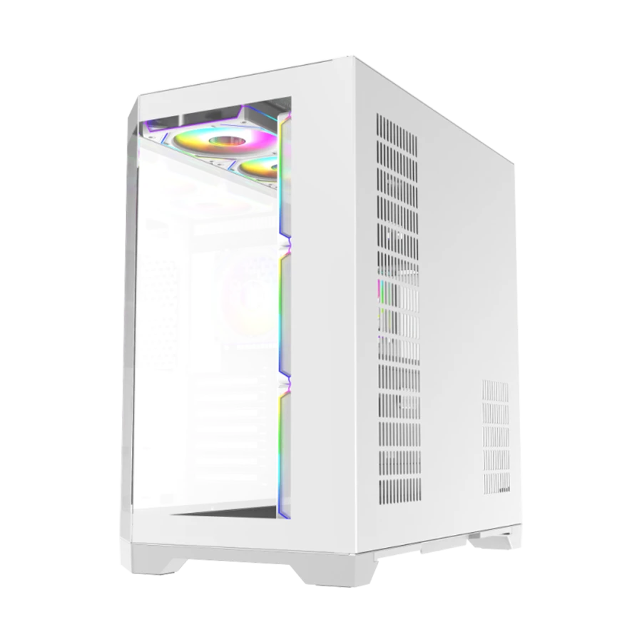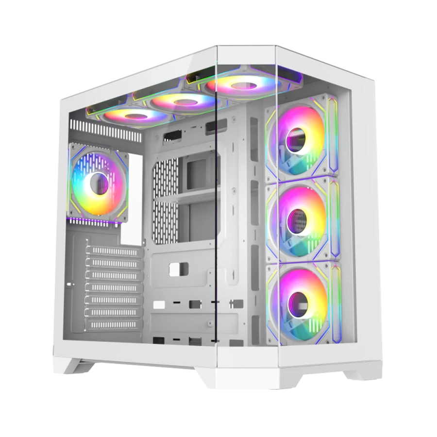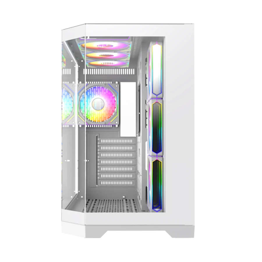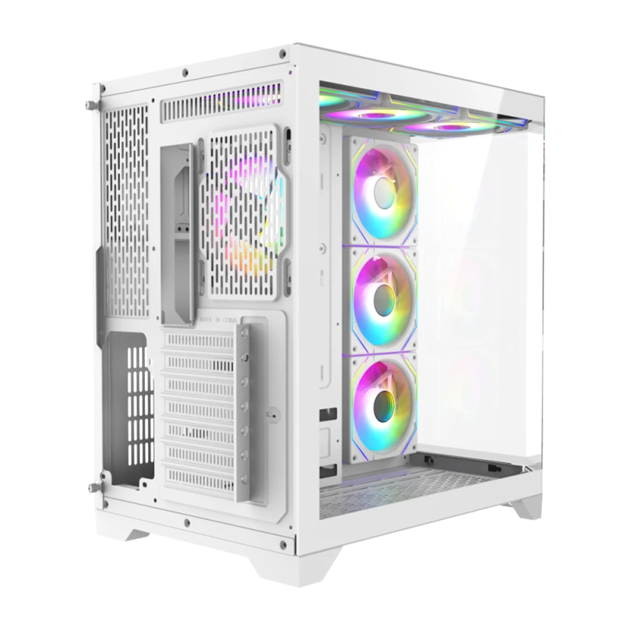 کیس گیمینگ گیم مکس GAMEMAX Hype-A WH با طراحی ۲۷۰ درجه پانورامیک و پنل‌های شیشه‌ای جذاب در جلو و کناره‌ها، نمایی خیره‌کننده از سخت‌افزار داخلی را فراهم می‌کند. استفاده از شیشه سکوریت باعث شده نگاه کاربران به‌راحتی به فضای داخلی کیس جلب شود. این طراحی برای گیمرهایی که به زیبایی و جلوه RGB اهمیت می‌دهند، یک انتخاب ایده‌آل است.