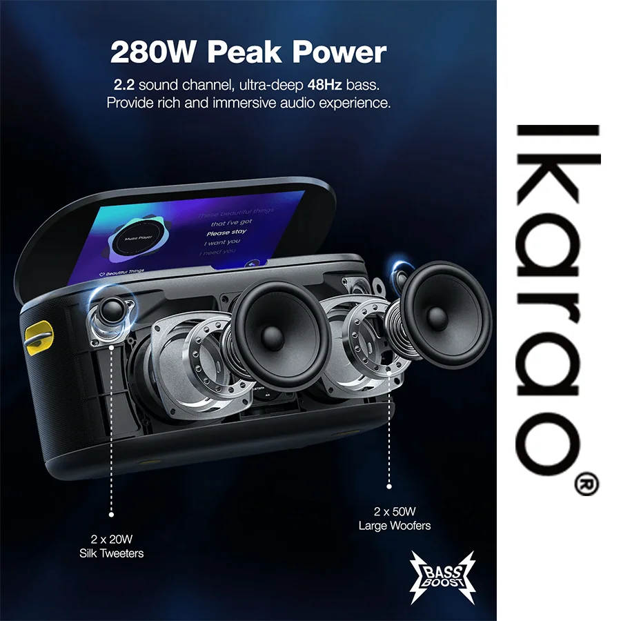 باتری 71 وات ساعتی، زمان پخش تا 6 ساعت را تضمین میکند. میکروفونهای بیسیم داخلی با باتری مستقل و برد بیش از 10 متر، امکانات کاملی برای اجرای کارائوکه و سخنرانی فراهم کردهاند. همچنین در اسپیکر با پشتیبانی از بلوتوث 2.4 و وایفای با برد 50 متر، اتصالات سریع و بدون قطعی را تجربه خواهید کرد.