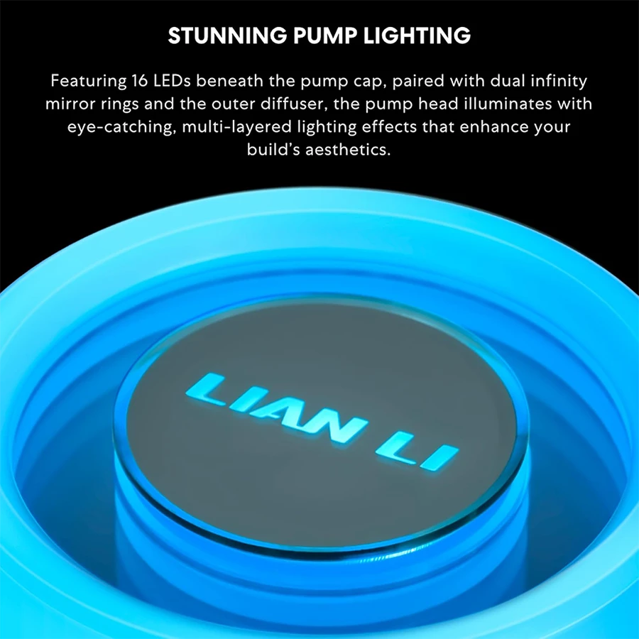 در بخش پمپ، نورپردازی ARGB با طراحی آینهای دوگانه و ۱۶ الایدی تعبیه شده که جلوهای مدرن به سیستم میبخشد. در کنار این جلوهها، درپوش قابل چرخش لوگو این امکان را میدهد تا جهت لوگو با جهت نصب هماهنگ شود. این ویژگی، زیبایی و نظم ظاهری سیستم را در هر زاویهای حفظ میکند و برای کسانی که ظاهر کیس اهمیت دارد، بسیار کاربردی است.