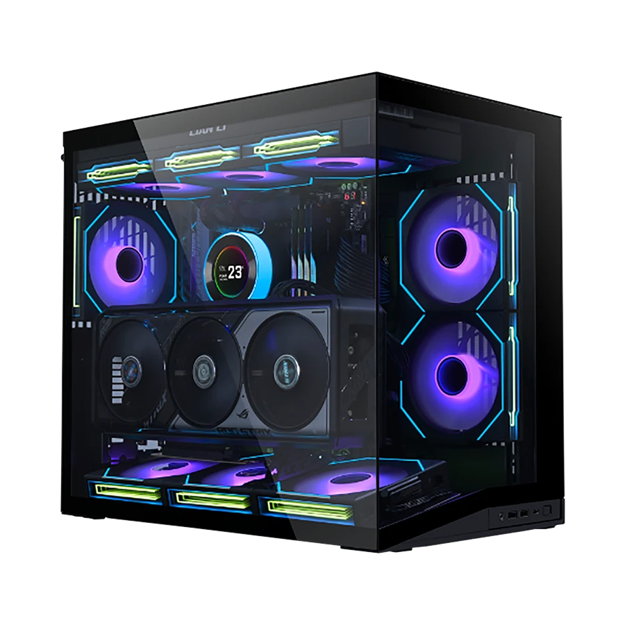 یکی از ویژگیهای مهم کیس O11D MINI V2 ، طراحی زاویهدار ۱۰ درجهای در بخش کف است. که جریان مستقیم هوا را به سمت GPU هدایت میکند. این ساختار موجب بهبود قابل توجه دمای کارت گرافیک و عملکرد پایدارتر در بازیهای سنگین میشود. پشتیبانی از حداکثر ۹ فن ۱۲۰ میلیمتری و وجود فیلتر گرد و غبار در بخش زیرین، سیستم را همیشه خنک و تمیز نگه میدارد. همچنین قابلیت برداشتن ماژول I/O پایینی برای بهبود جریان هوای ورودی تعبیه شده است تا عملکرد خنککننده به حداکثر برسد.